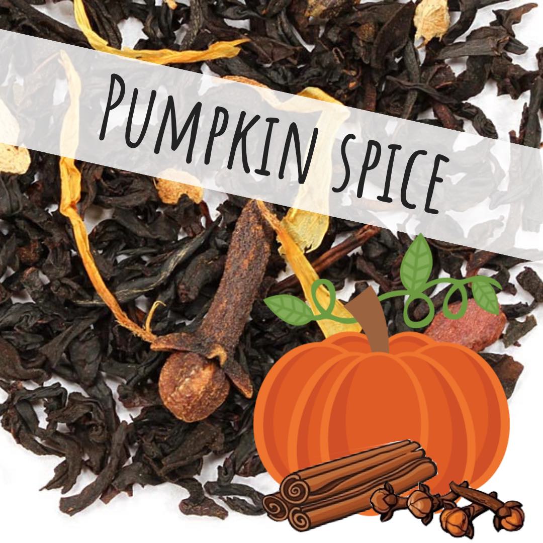 Ingredients: Black tea, natural pumpkin spice flavor, cinnamon bark, cloves, ginger root, cardamom pods and marigold flowers.