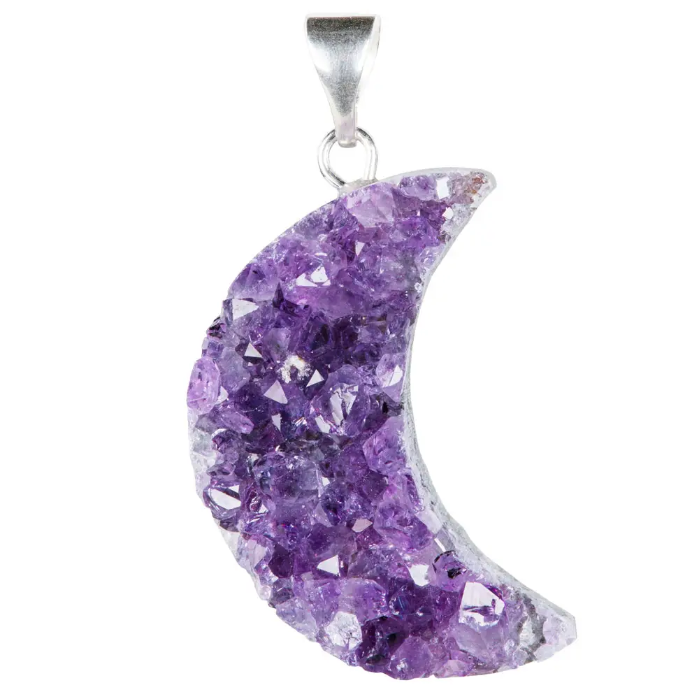 This smaller, about 1-1.5 inches, Amethyst Druzy moon pendants in sterling silver is a gorgeous addition to your pendant collection.