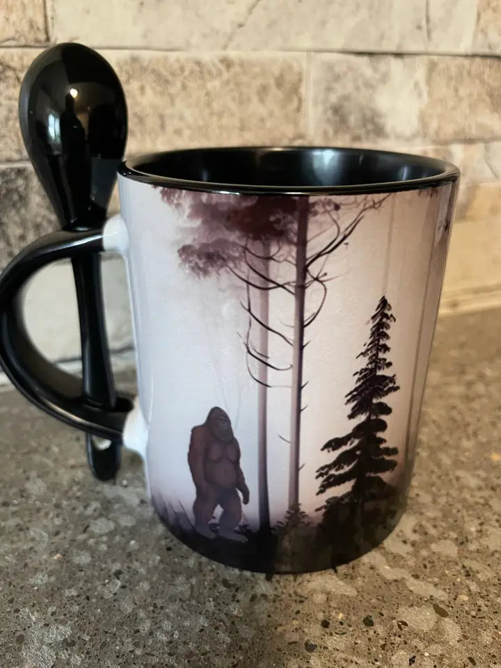 This mug displays a peaceful, misty forest with a Sasquatch on each side. The inside of the mug is black and there is a black stirring spoon in the handle. 11 oz mug is ceramic and dishwasher safe.