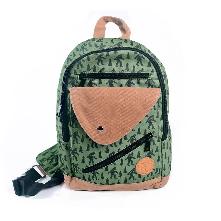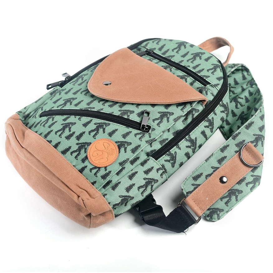 The important thing is that you believe in yourself! Bigfoot sure does. He marches proudly across this pattern with Fir Trees behind him on a sage green canvas
