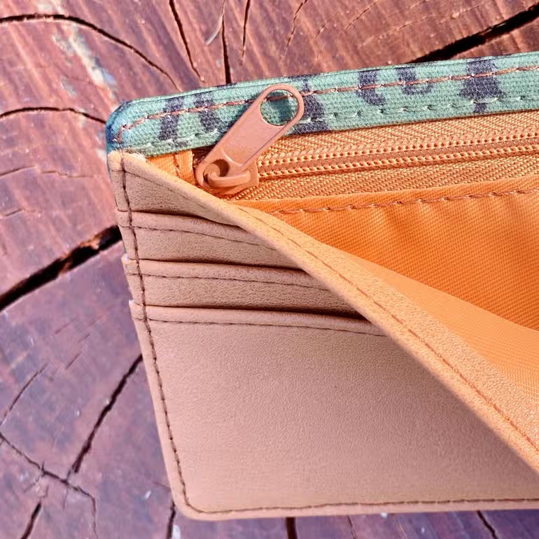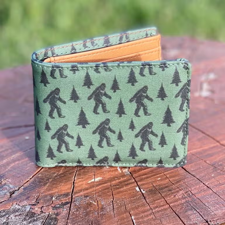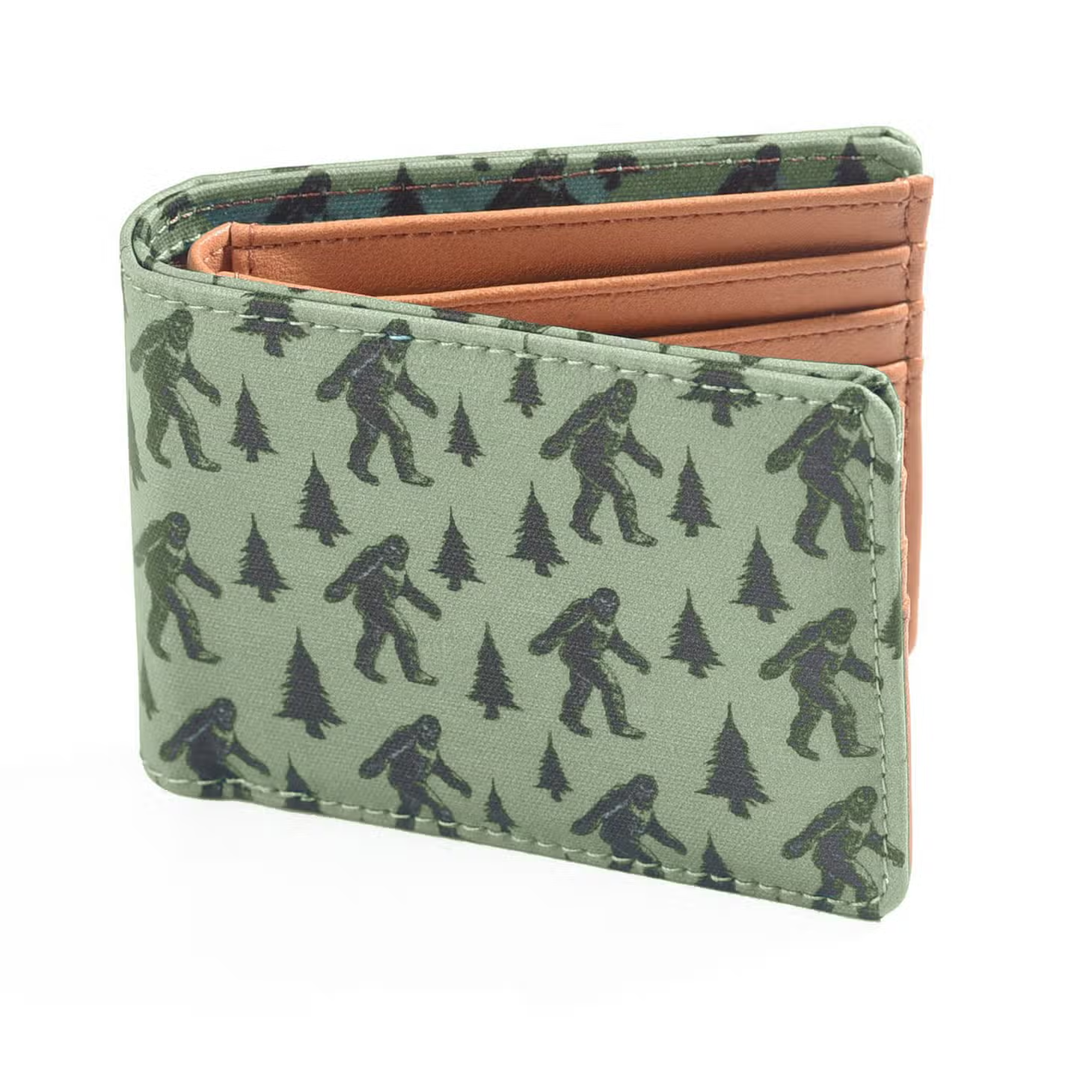 The important thing is that you believe in yourself! Bigfoot sure does. He marches proudly across this pattern with Pine Trees behind him on a mint blue-green canvas. Our compact and thoughtfully designed bifold wallet holds up to 8 cards, includes a cash slot and a zippered change compartment.