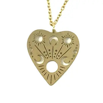 The charm hangs 1” off an 18” long chain; A small link cable chain made from gold plated stainless steel and is hypoallergenic.