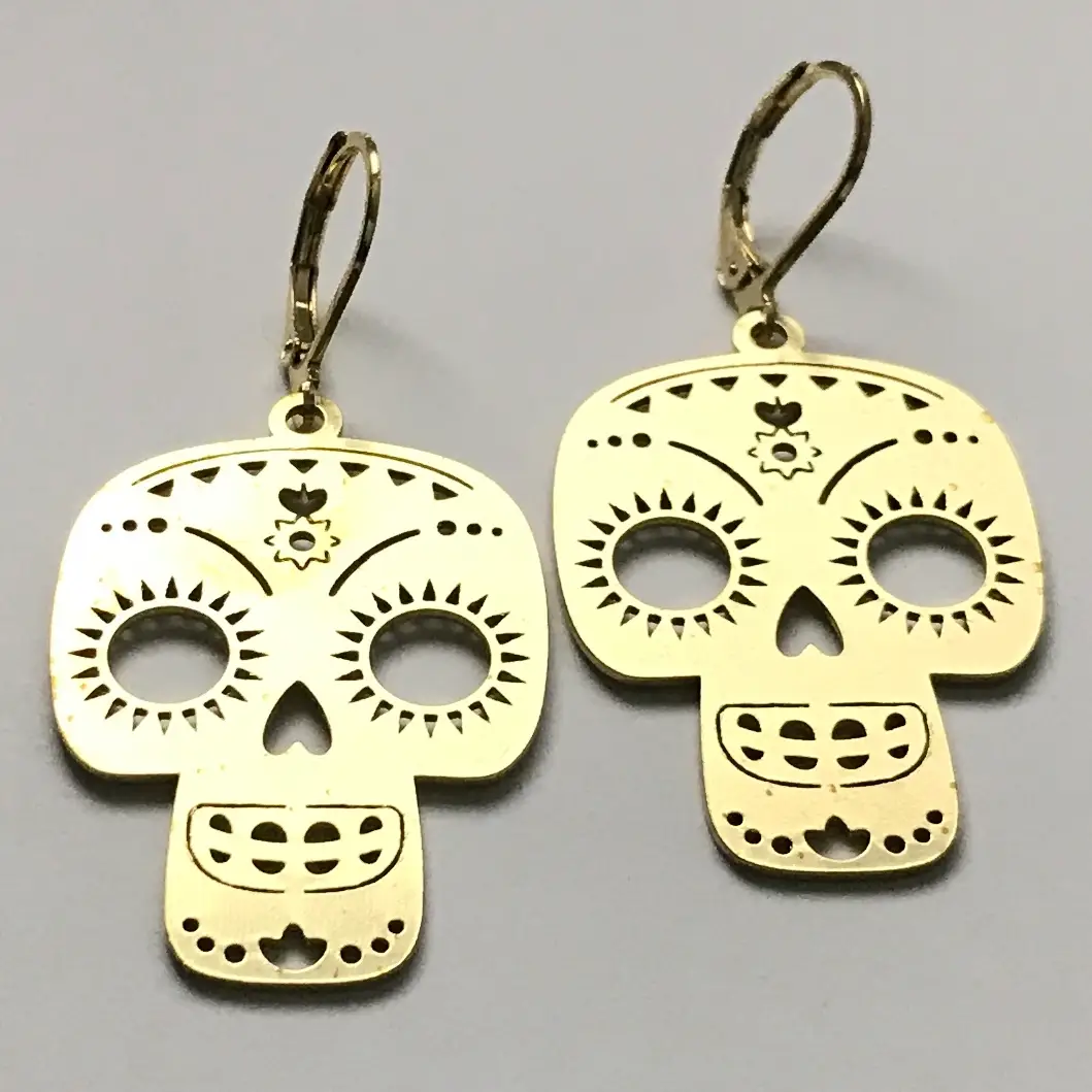 Brass Day of the Dead Skull Earrings hang 2” off of 24k gold plated stainless steel ear wires. Hypoallergenic.