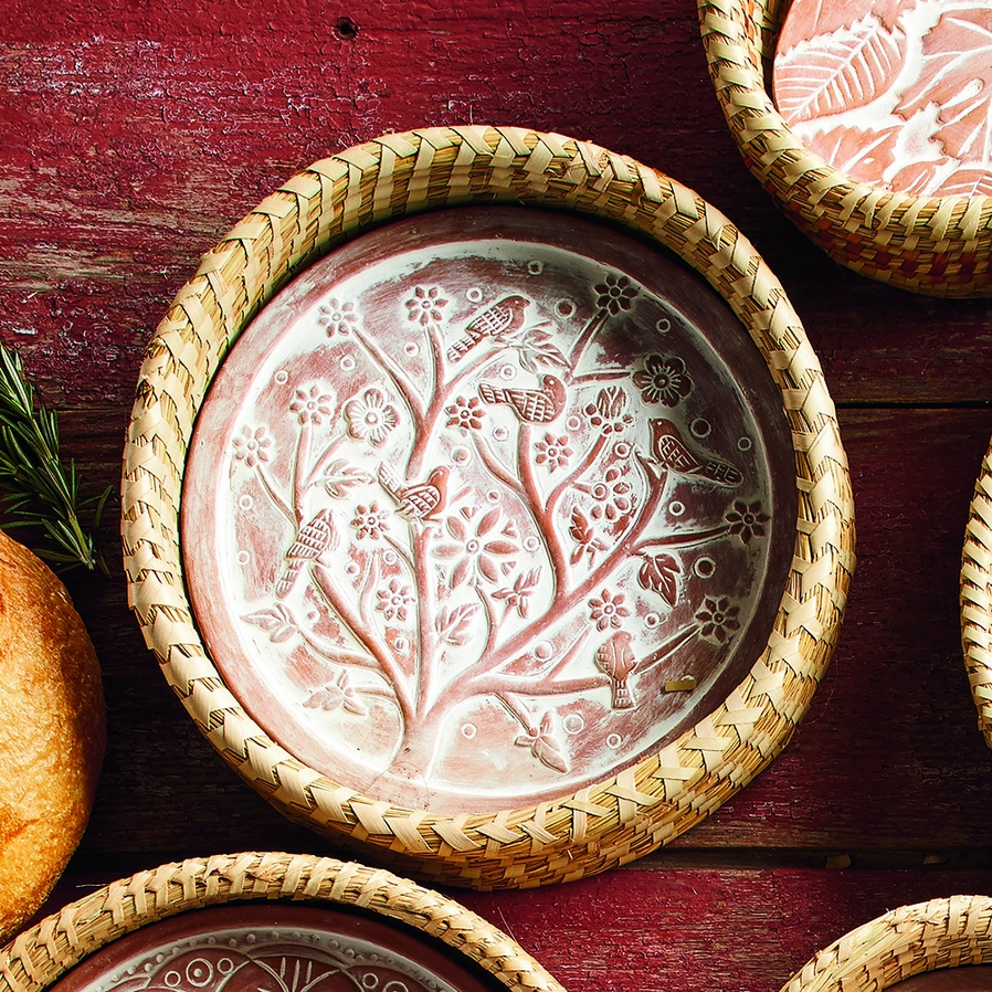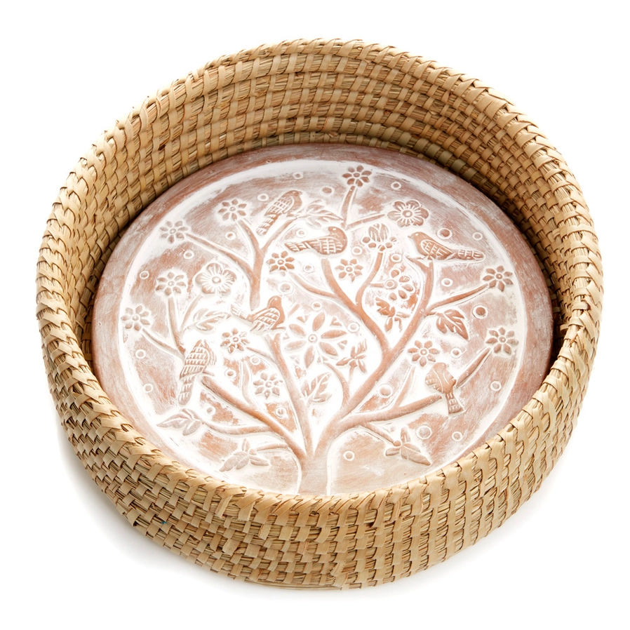Whitewashed terracotta stone is incised with a nature-inspired design and sits within a handwoven kaisa grass basket with dyed palm wrap detail. Warmer is oven safe. A popular gift item! Made by fair trade artisans in Bangladesh.