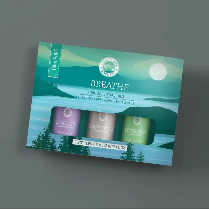 Essential Oil Blend Gift Box Set with 3 fragrances. Aromatherapy Gift Set -- Breath 100% Pure Essential Oils Magnatic closure box includes 3 fragrances: Lavender Peppermint Eucalyptus Size: 5mL bottle