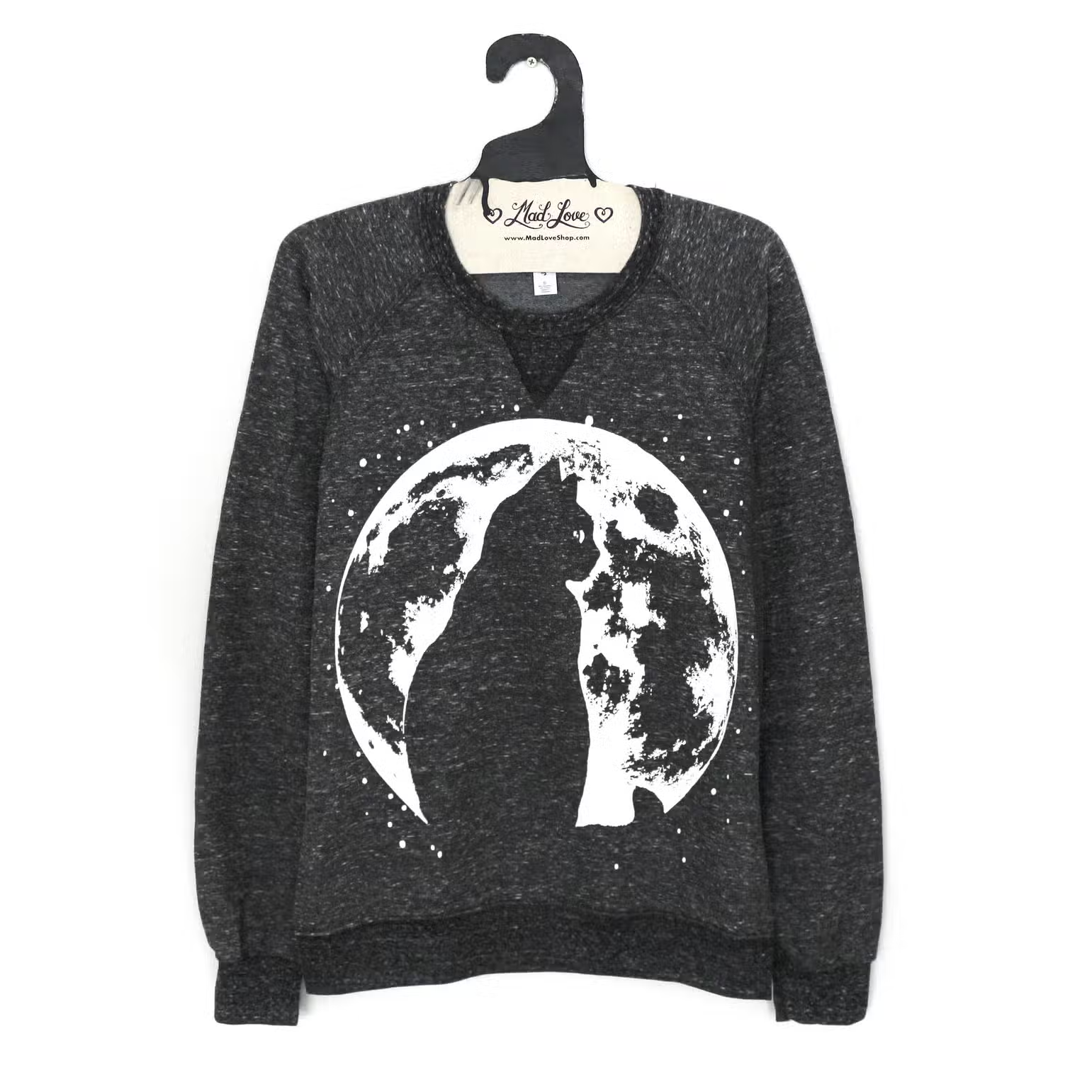 Unisex speckled Black Mid-weight French Terry sweatshirt with Cat Moonriver print.