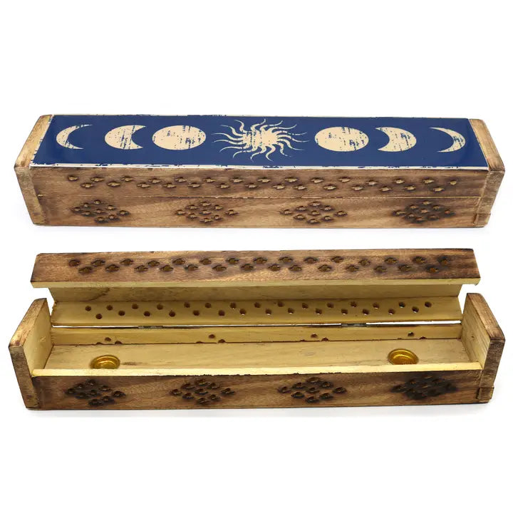 Wooden Incense Box Burner carved into an ornament for your home, holding up to four pieces of burning stick or cone incense at a time, its fragrant and purifying smoke gently rises through the many decorative cut-outs in the shape of diamonds. Burner is hand-carved in India from sheesham wood, also known as Indian rosewood. These burners combine a classical Indian style with your favorite aroma and are designed specifically to enhance the natural dance of the incense fragrant smoke as it wafts out of the hand-carved pattern. Size: 12" Length Material: Mango Wood Size, color & texture of wood may vary Handcrafted in India