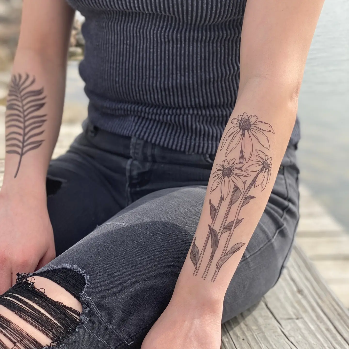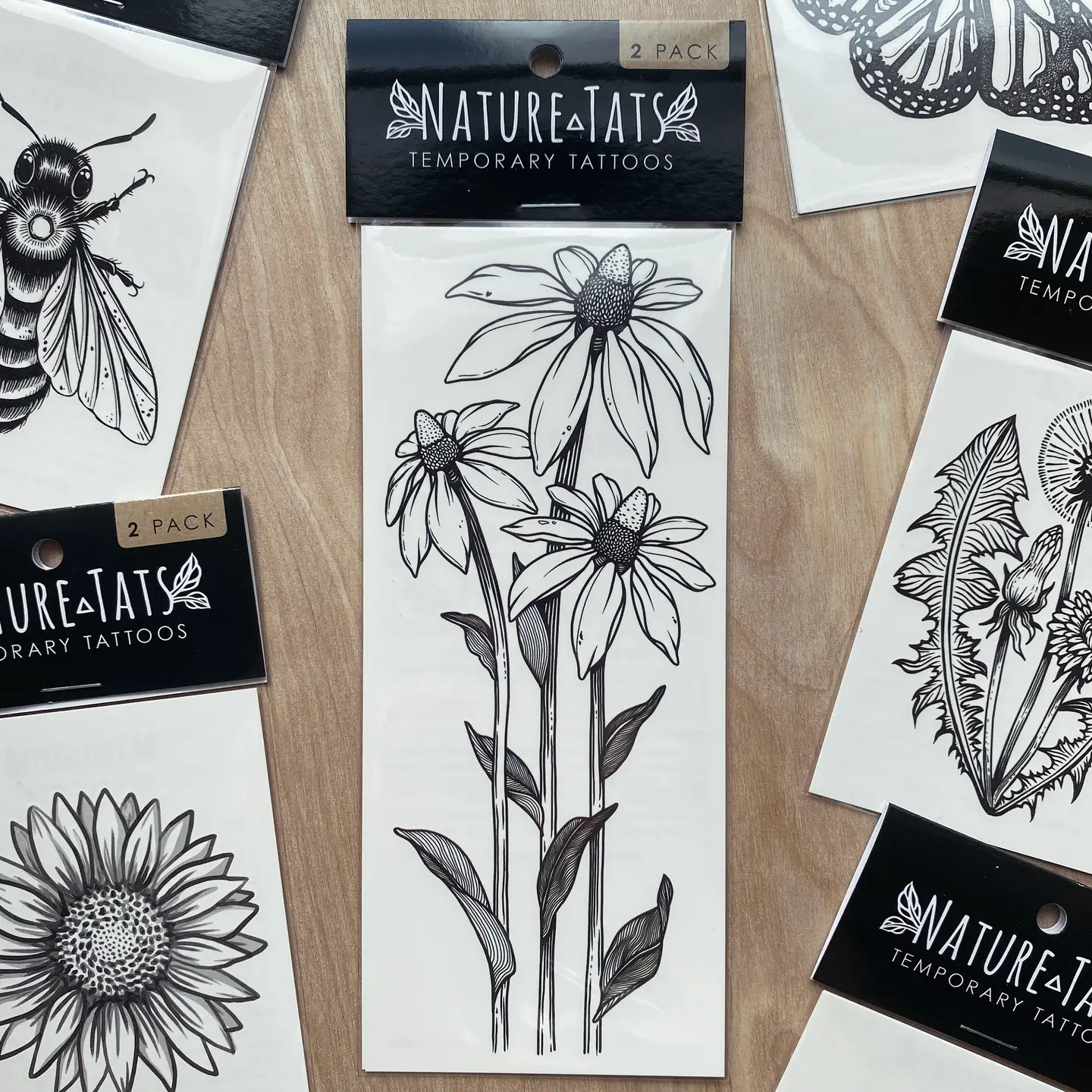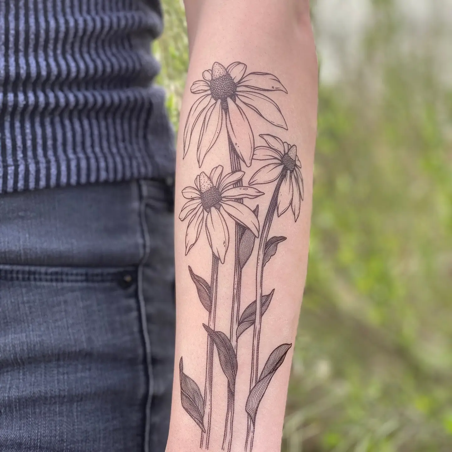 Coneflower temporary tattoo. This design features a bouquet of three coneflowers, inspired by the beautiful yellow Texas coneflowers. They stand tall with detailed leaves that clasp to their stems, whimsically wild petals, and an upright position just waiting for sunshine and pollinators. This design is one of many native Texas wildflowers to be added to my collection, it pairs wonderfully with our Bluebonnet tat.