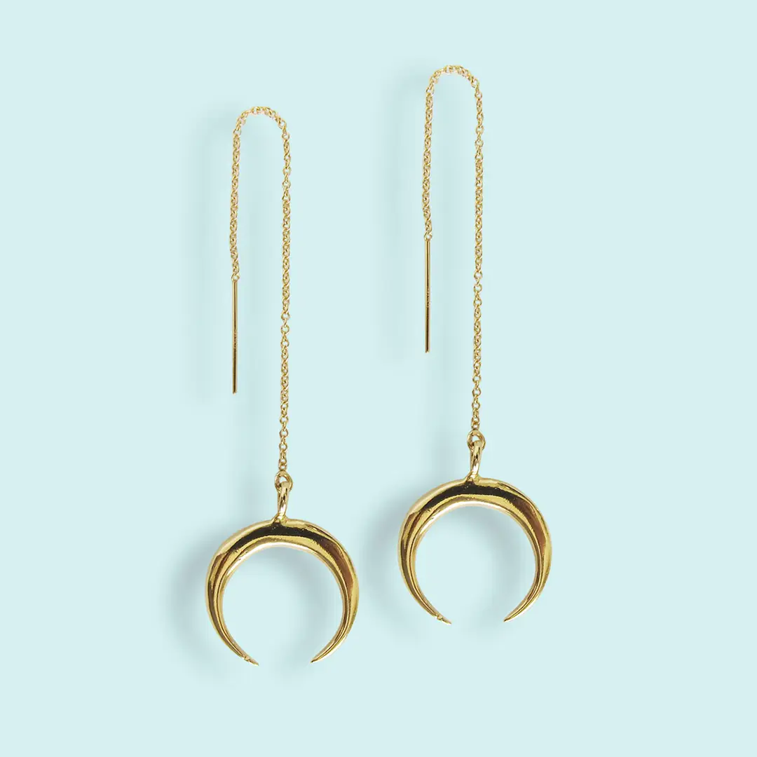 Metal: Vermeil moon, 14kt gold filled ear threader Length: 1" W moon, 2"L Adjustable Chain Ear Threader