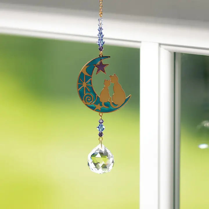 Featuring a stained-glass effect with gold metal outlines filled with a translucent resin that allows light to shine through, our Crystal Dreams are adorned with genuine Austrian crystals and look beautiful from every side. When hung in a window with the light streaming in, these colorful ornaments are breathtaking. Held sacred by ancient Egyptians, cats symbolize mystery and watchfulness. These cats admire the moon together surrounded by a chain of crystals that sparkle and shine. Works equally well as a sun catcher or Christmas ornament or hung in an office or dorm room. It's especially beautiful when hanging in the window or in front of a light.
