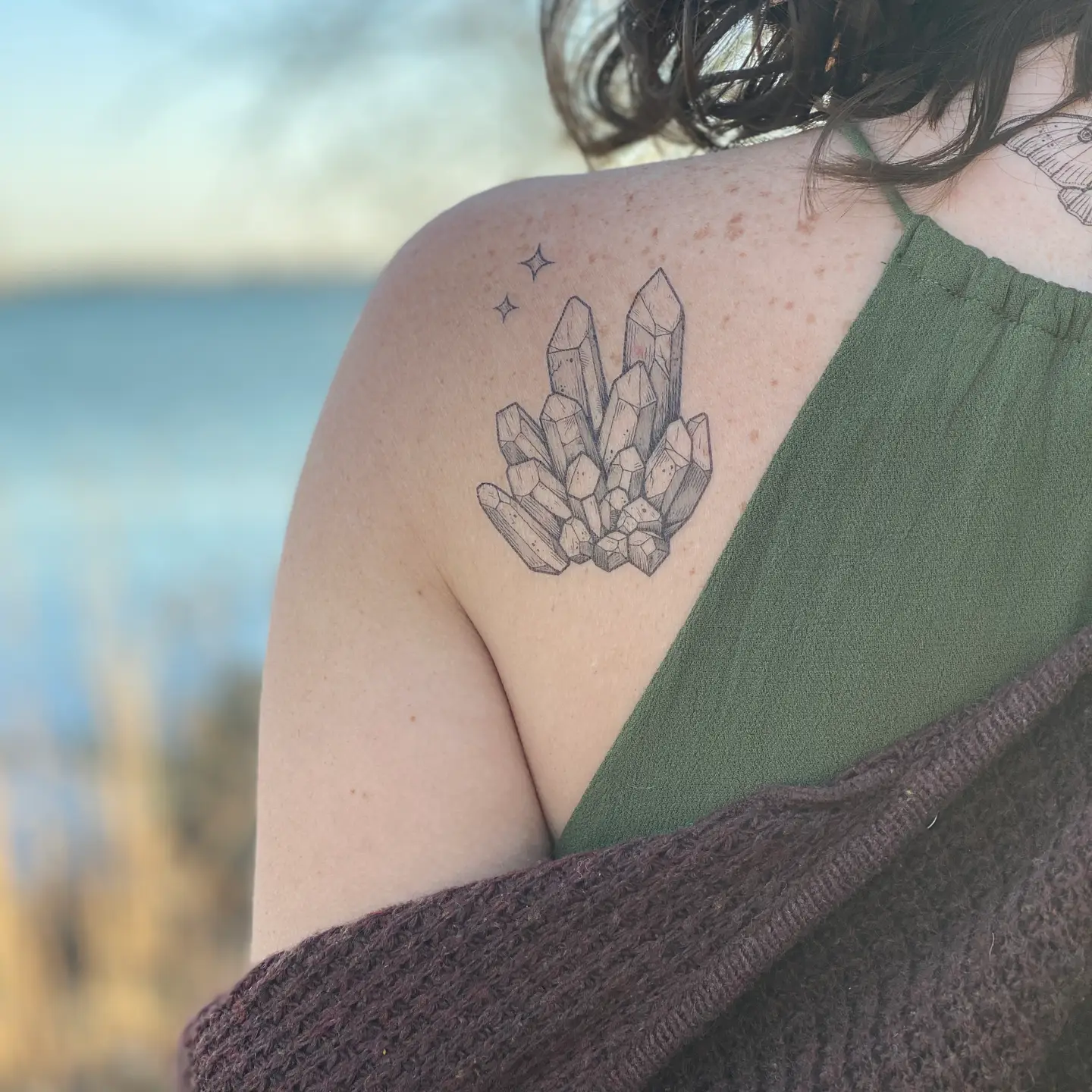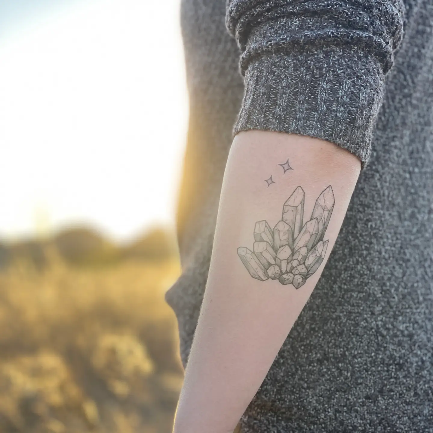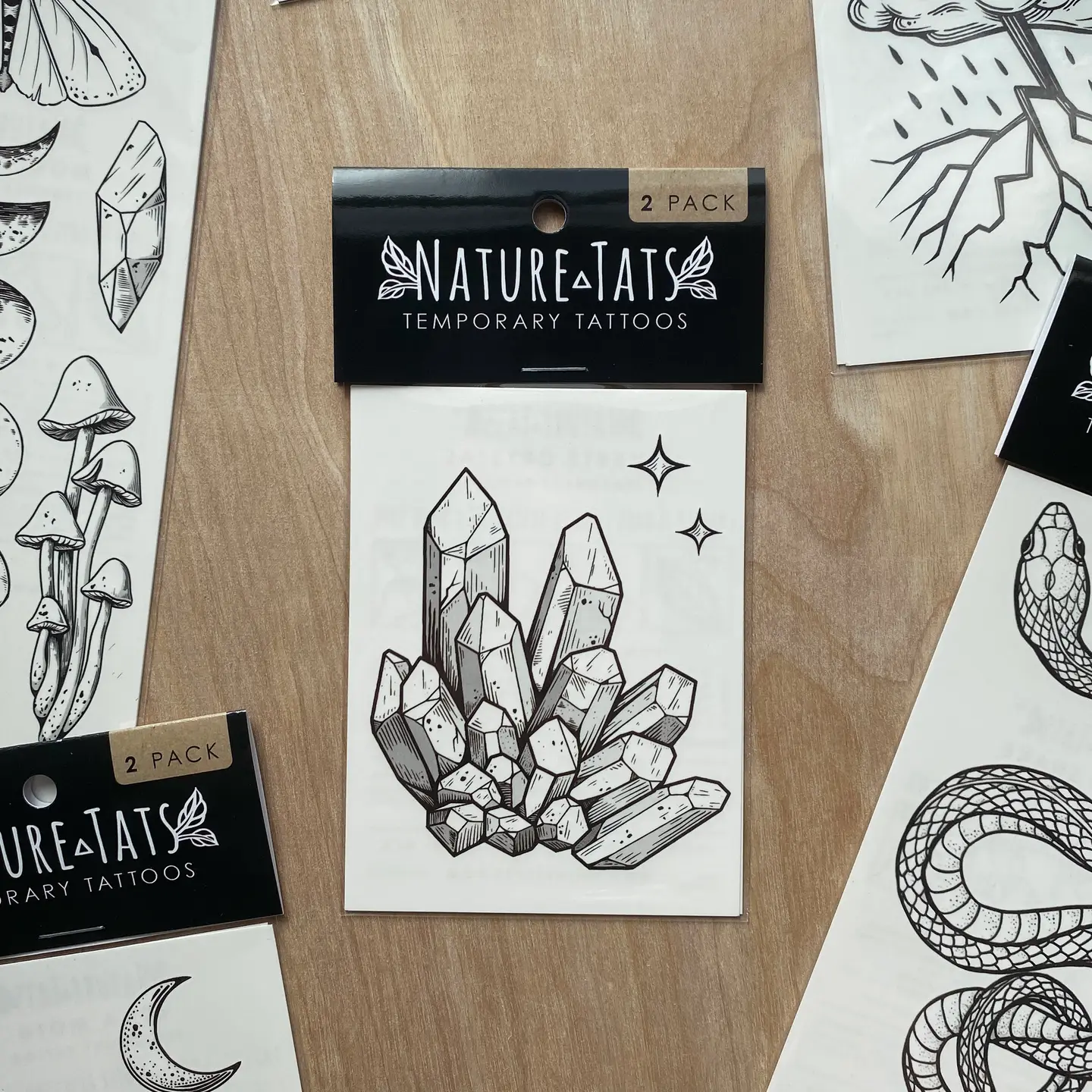Quartz crystal temporary tattoo. This design features a cluster of quartz crystals and all of their spiky glory. This naturally sparkly chunk of stone is a rock-collectors dream and a spectacular gift for lovers of shiny things.