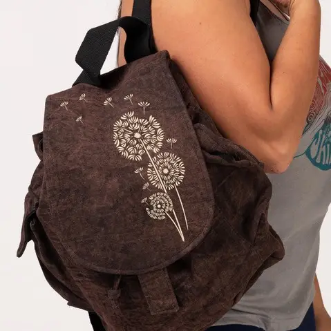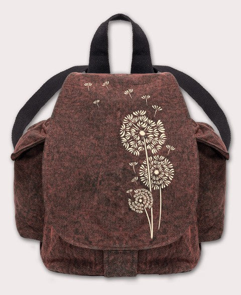 Tap into your natural vibe with this Dandelion Seed Print Slouchy Backpack. Whether you're stashing your essentials in the handy side pockets or filling the spacious main compartment, this bag has you covered. The delicate dandelion seed print on the front adds a touch of whimsy, while the black cotton lining inside keeps everything cozy and secure. Perfect for the free spirit on the go. Zipper closure and black lining. 12 x 14 x 5 inches with a 30-60 inch removable and adjustable strap. Acorn Brown.