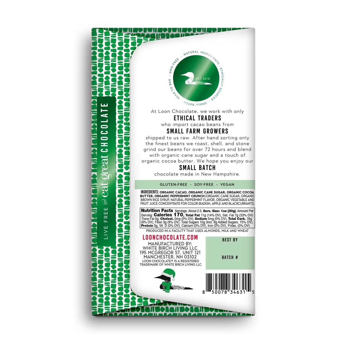 Starting with our bean-to-bar 70% Dark Chocolate, we top each bar with an all-natural & organic Peppermint Crunch to recreate a classic holiday treat!