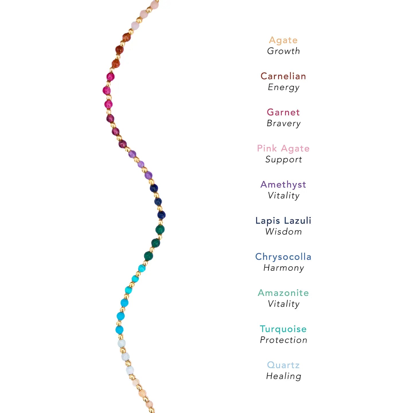This elegant anklet features an array of vibrant, 2mm gemstones, each carrying unique healing properties to promote balance and well-being.