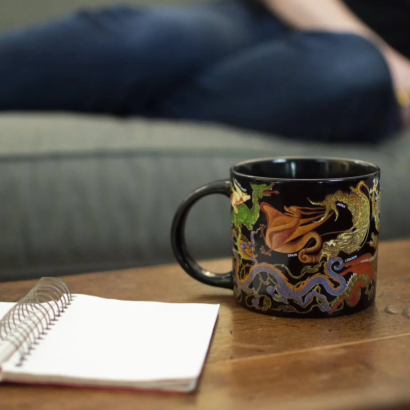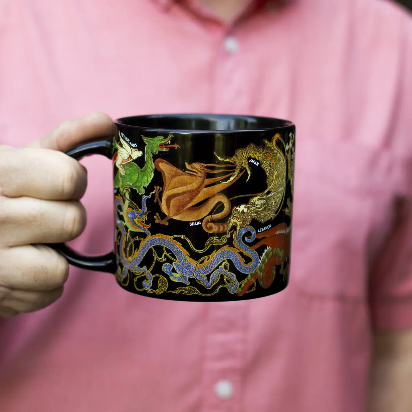 Our Dragons mug features 19 dragons from around the world. Perfect for any hot beverage: coffee, tea, hot chocolate, pumpkin spiced beverage.