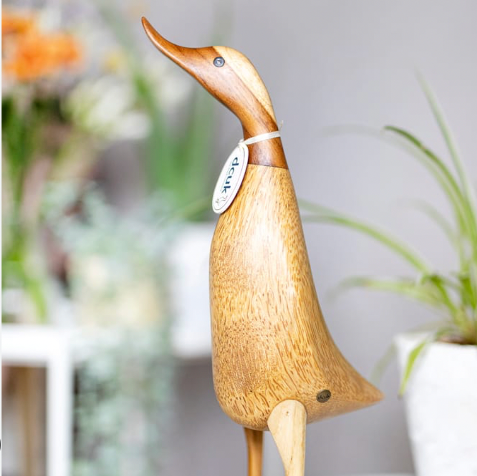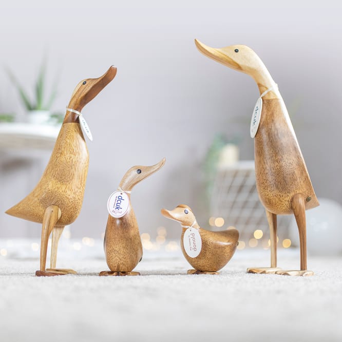 Inspired by a chance encounter with an Indian runner duck of audacious speed and charm, each character is hand-carved by artisans in Indonesia. Here, exquisite figures have been sculpted from bamboo for generations - and runner ducks roam free.