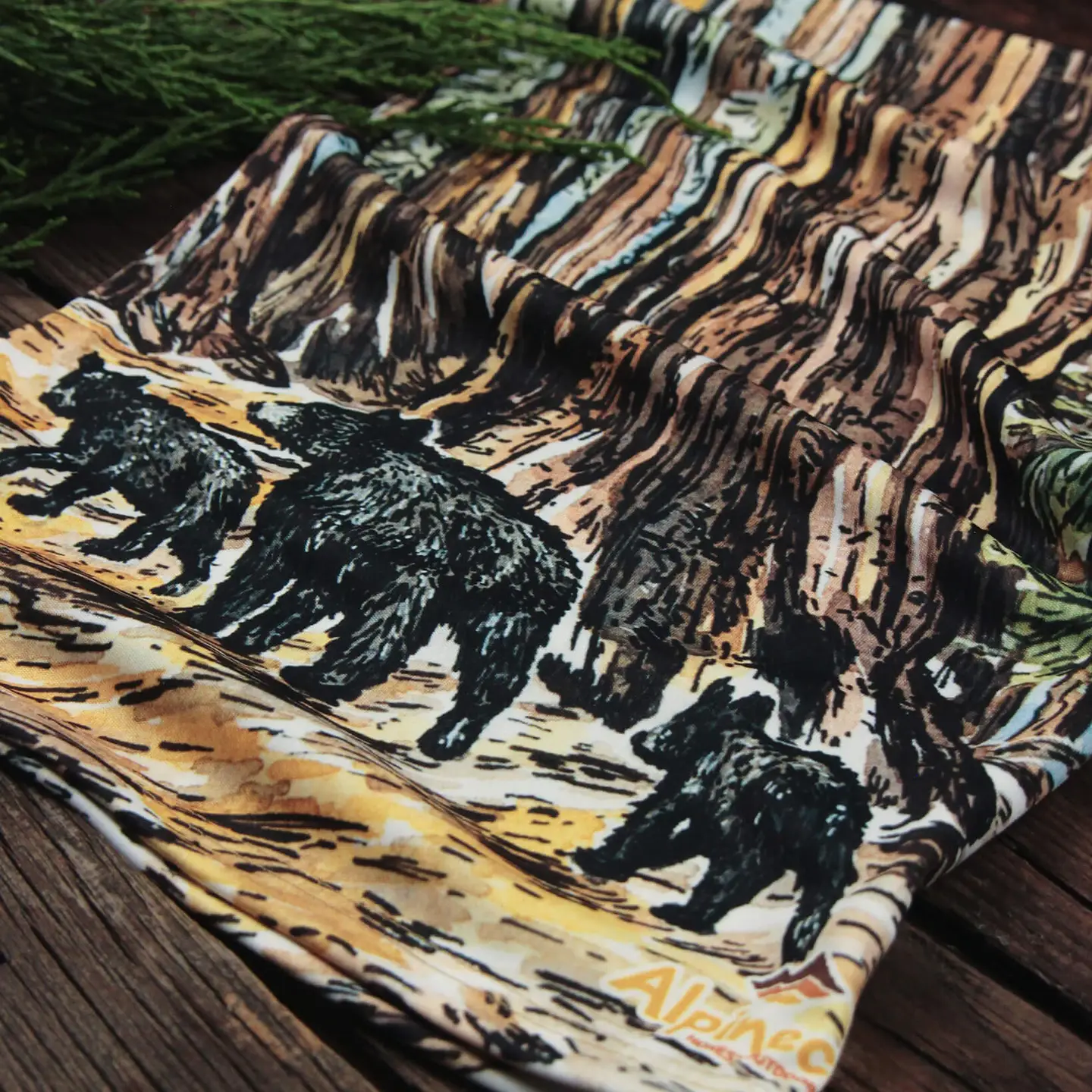 The Forest Bears neck gaiter features a custom pen, ink, and watercolor design of a mother black bear and her cub in the forest. Created for, and sold at, Sequoia and Kings Canyon National Parks, but equally at home in any forest or landscape in the country!