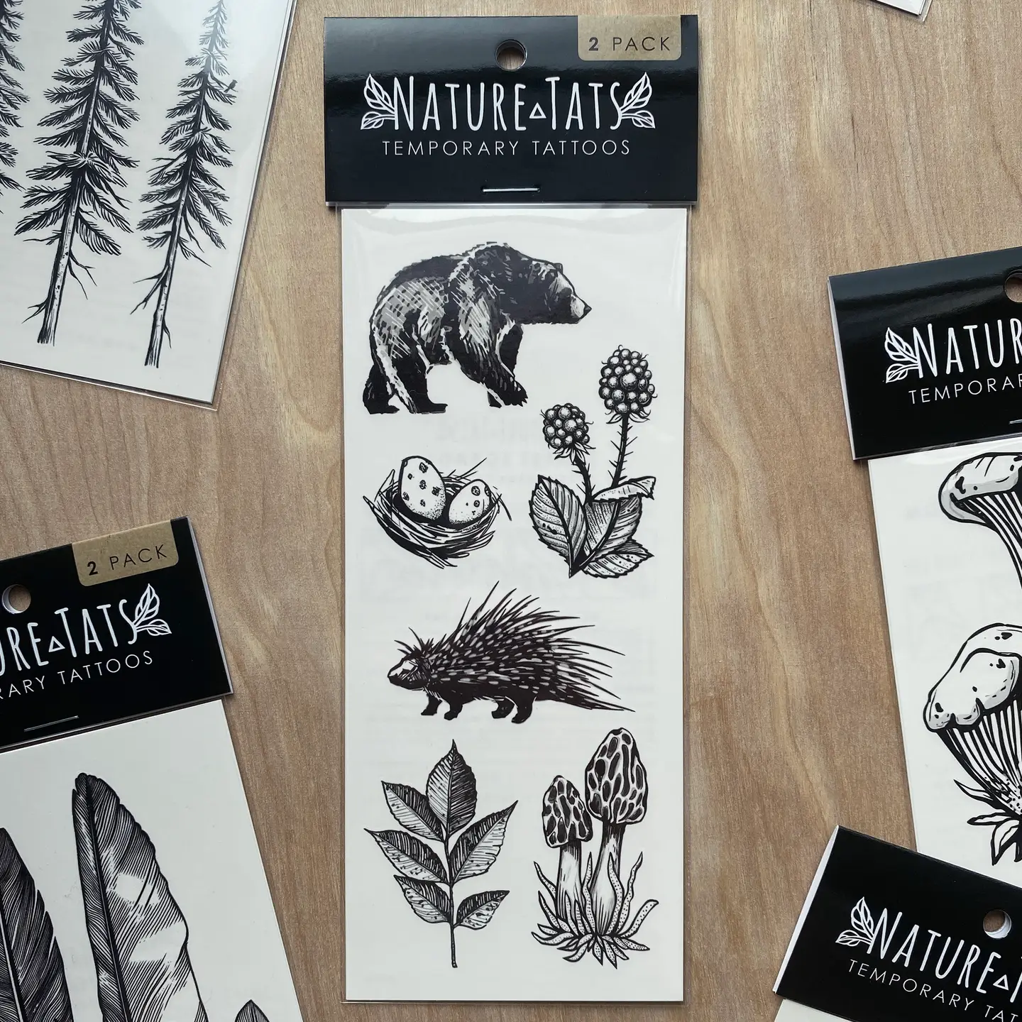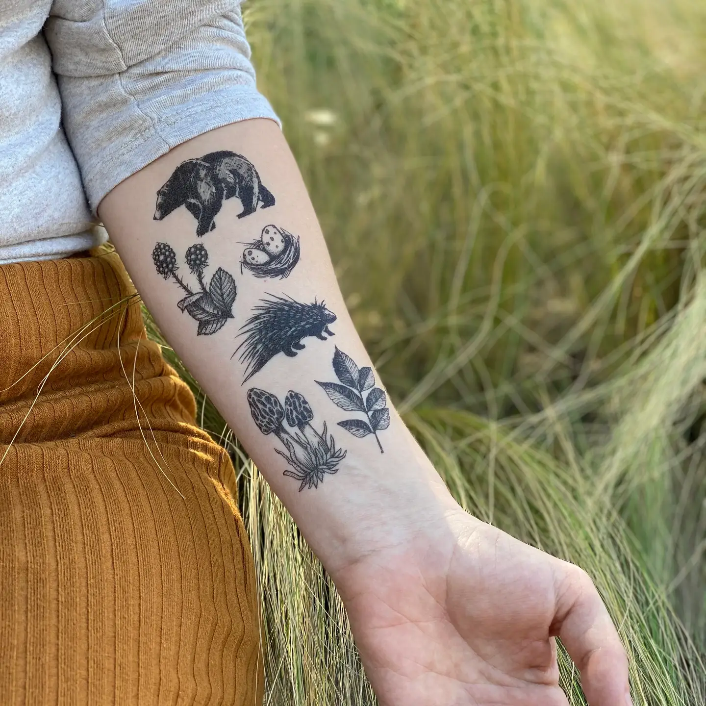 Forest Forage temporary tattoo. Peacefully roaming and foraging, this bear and porcupine explore the forest for snacks. Also featured in the collection are wild blackberries, spotted eggs in a nest, morel mushrooms, and a fallen ash leaf. The sheet is 3" by 7".