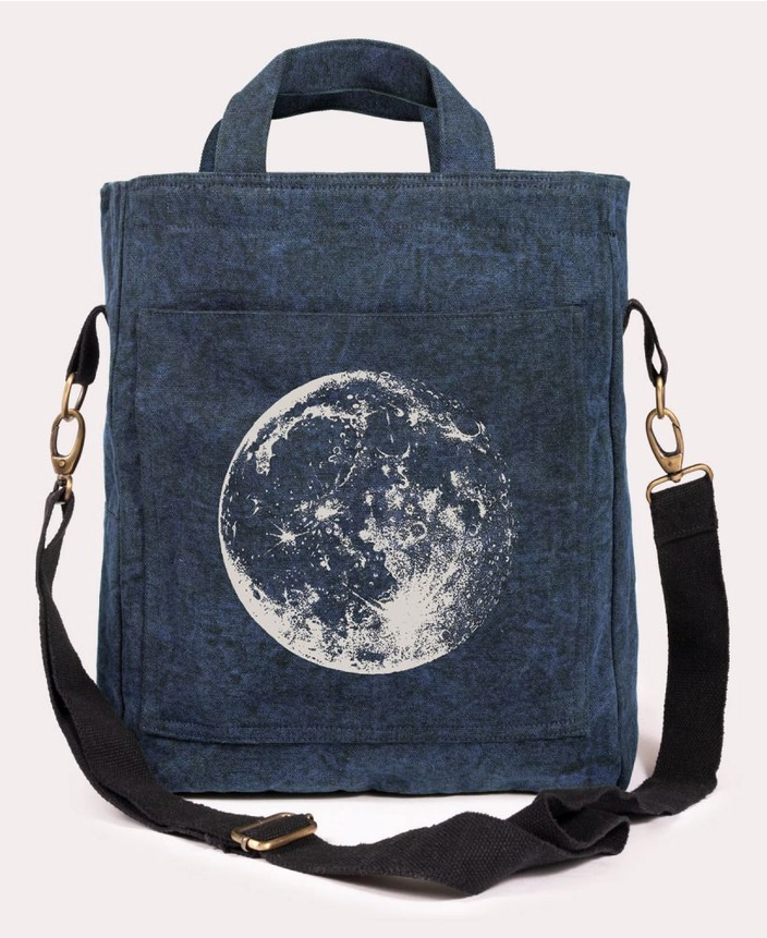 Shine on, the world needs your light! Carry this Full Moon Forager Bag with its depiction of a full moon on a heavy, cotton canvas fabric. Cherish the moon vibes as you harvest and gather whatever you find inside this versatile bag. Features an outside open pocket and zipper closure. Use its clasps and hooks to wear as a crossbody or remove them to carry as a handbag. Fully lined inside with zipper closure and small inside pocket. 12 x 14 x 5 inches with a 30-60 inch removable and adjustable strap. Ocean Blue.