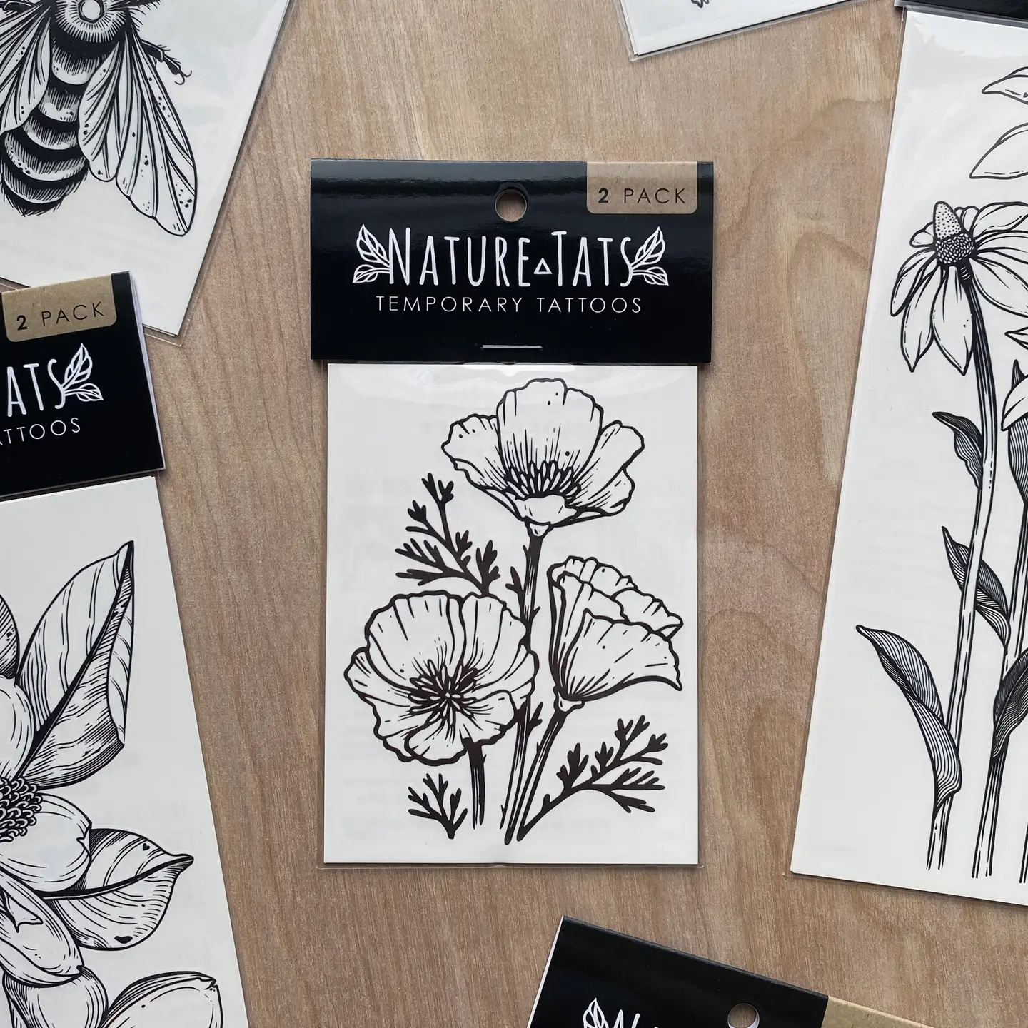 Golden poppy flower temporary tattoo. This lovely flower is neon orange in real life, the state wildflower flower of California but it can be found growing in many other areas of the US.