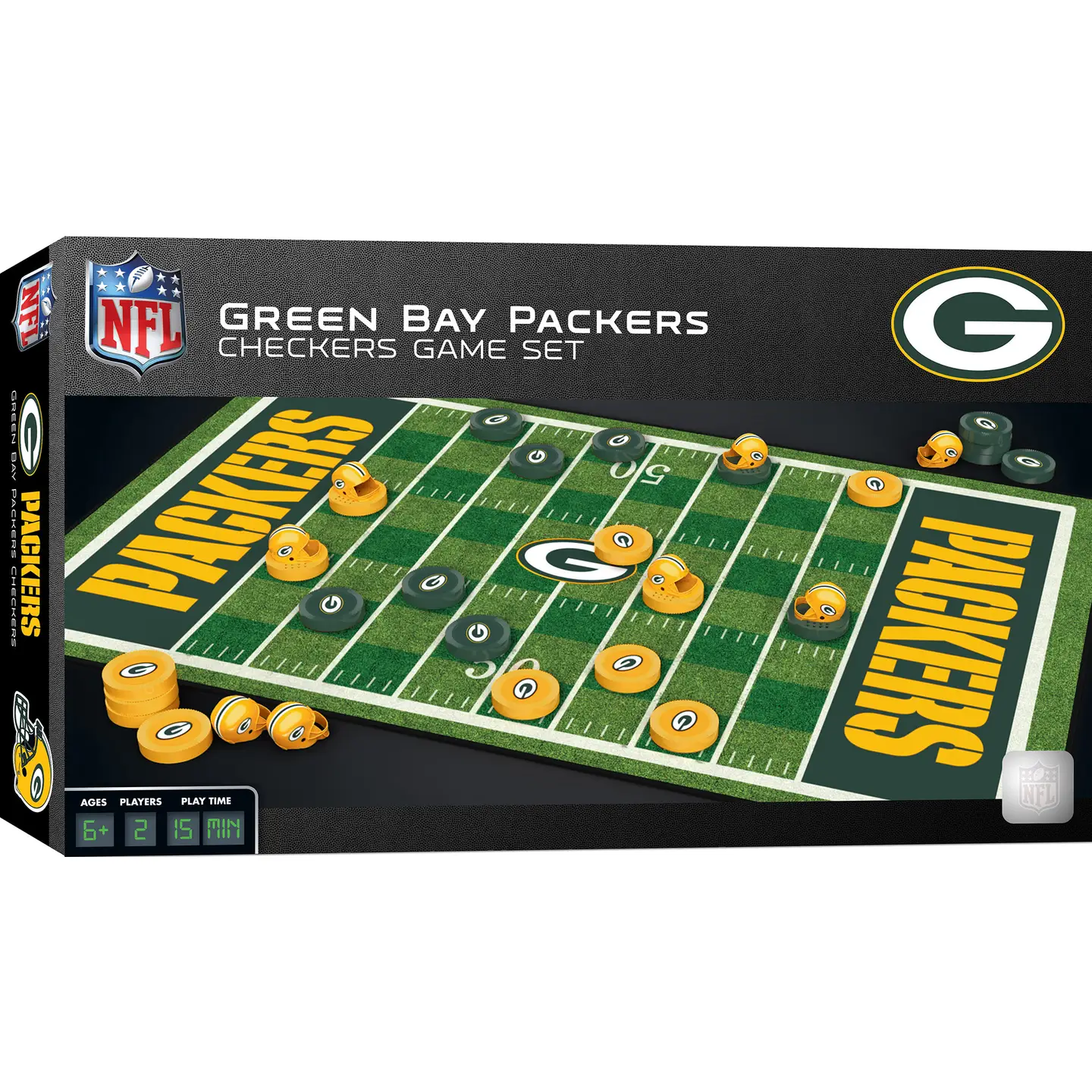 If you're a fan of the Green Bay Packers, then you're going to love this officially licensed MasterPieces NFL Green Bay Packers Checkers Board Game. This classic game of checkers is a ton of fun for children and adults ages 6 and up, and it's a great way to show your Green Bay Packers pride. This checkers game comes with 25 Green Bay Packers checkers pieces, 8 football helmet king pieces, a 13 inches x 21.375 inches game board, 1 sticker sheet, and an instruction sheet. So get ready to put your skills to the test and crown yourself the checkers champion!