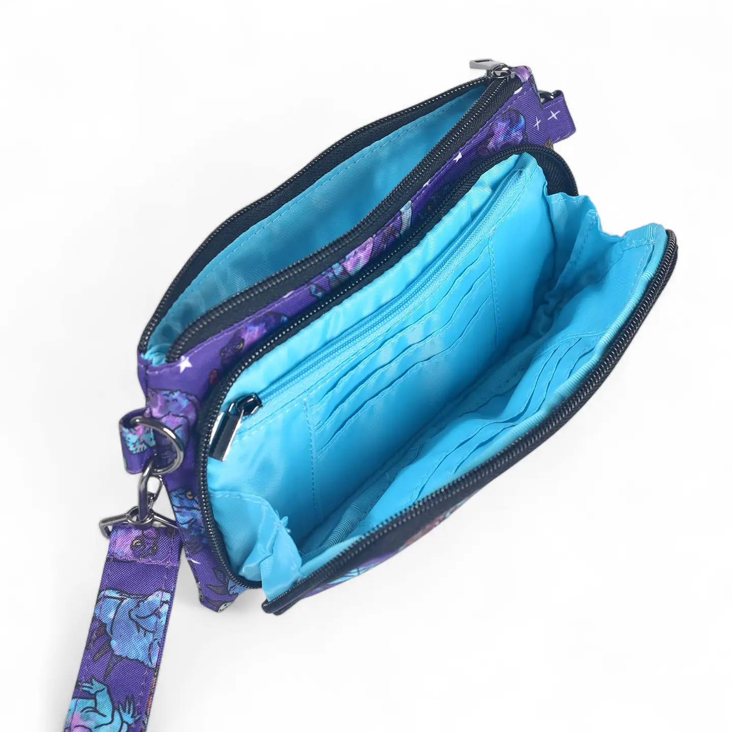The wallet compartment includes 6 designated card slots, a zipper change compartment and a cash or receipts sleeve. The larger zippered compartment fits a passport and most smart phones.