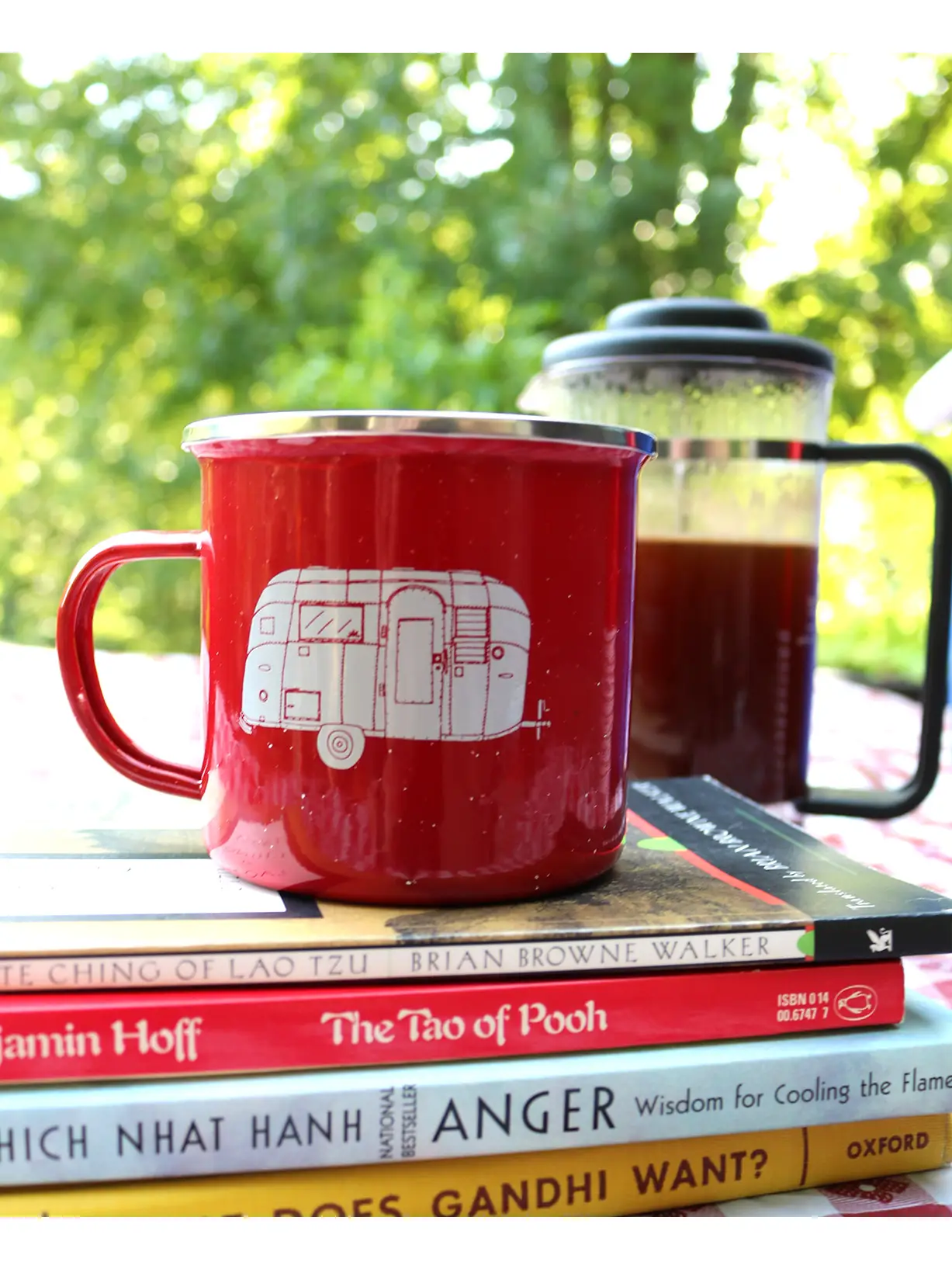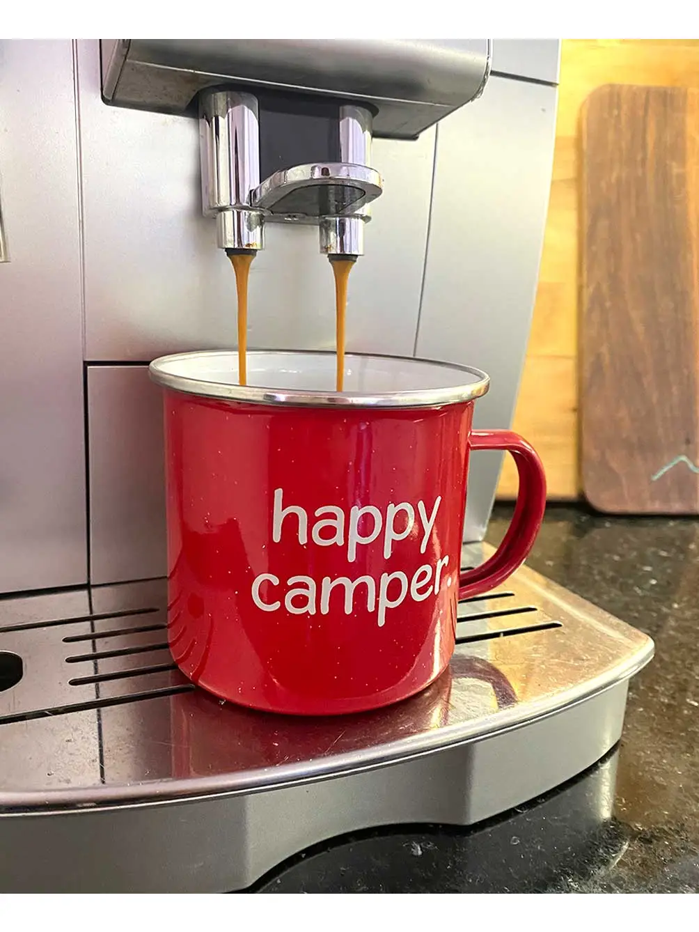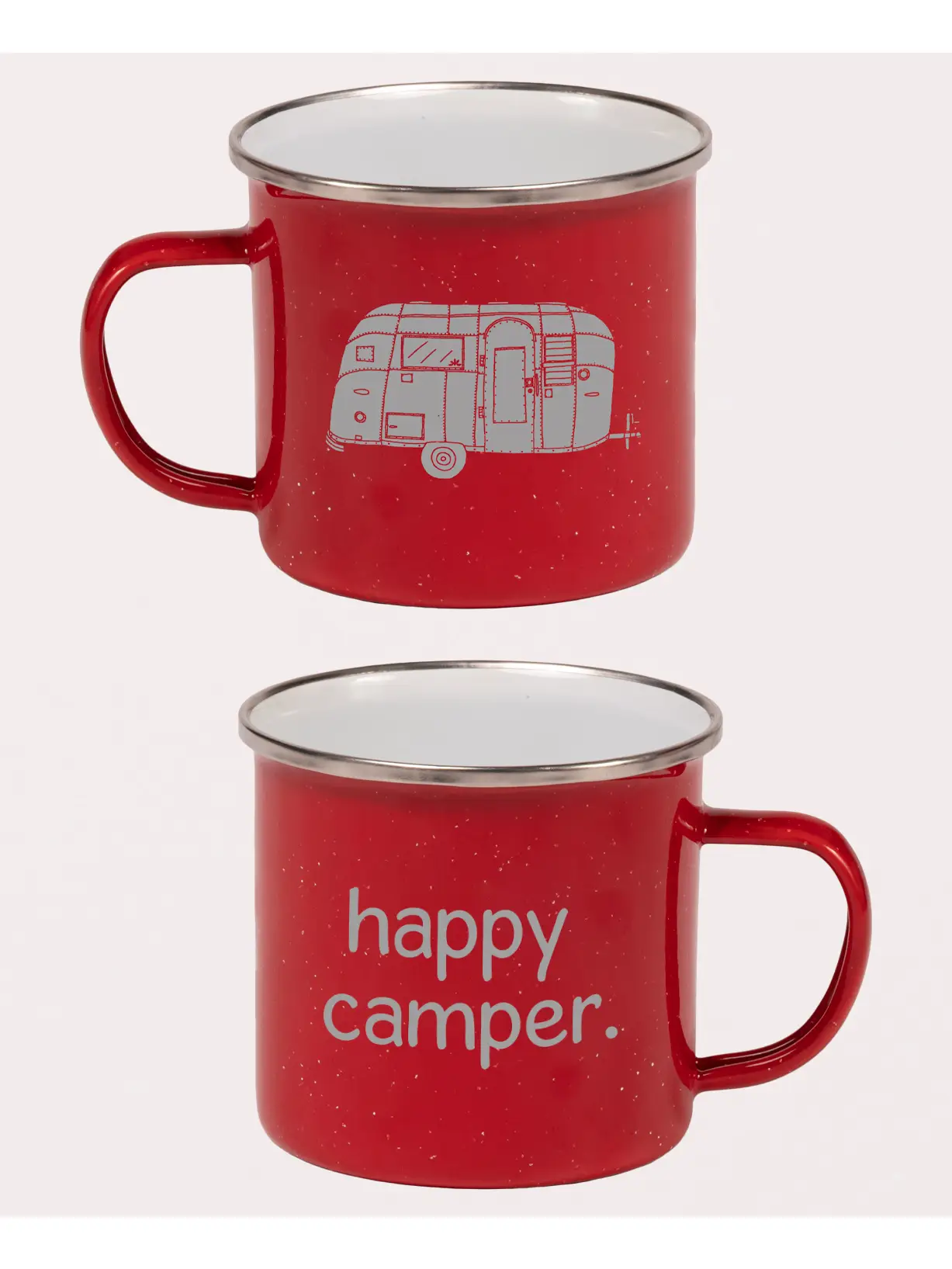 Get ready for a memorable adventure with this Happy Camper Enamel Camping Cup! Drinkware designed to hold 16 ounces of your favorite hot soups or beverage, this sleek, speckled design will keep you happy. Features a c-shape handle and a stainless steel rim. Create happy times with its retro-style camper art and the words: happy camper. Red with speckles. Note: Due to the rustic nature of our camping cups, you may see small imperfections such as extra speckles, dents, bubbles, and other markings. Wabi-Sabi!