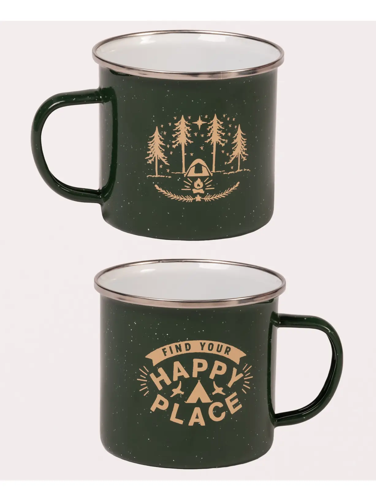 Take this Happy Place Enamel Camping Mug into the mountains, forest, or your favorite outdoor getaway! The camping scene on one side and the FIND YOUR HAPPY PLACE text on the other will soothe the soul as you spend some time in your happy place. Designed to hold 17 ounces of your favorite hot or cold beverage. Features a stainless steel rim and a speckled, enamel coating. Dark Green with speckles. Note: Due to the rustic nature of our camping cups, you may see small imperfections such as extra speckles, dents, bubbles, and other markings. Wabi-Sabi!