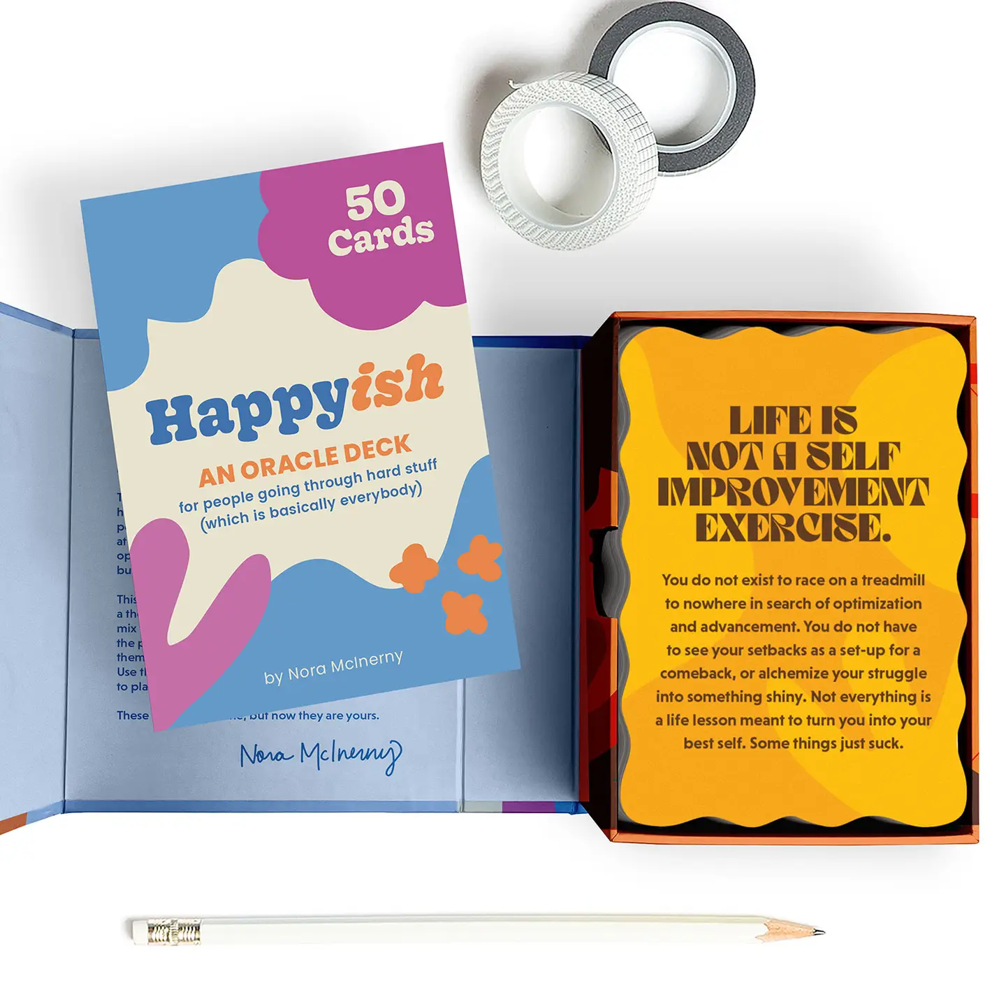 Studies have shown that the pursuit of happiness can negatively impact your mental health (wtf? . . . and yet, somehow, we suspected as much). Nora McInerny-celebrated author and host of the Terrible, Thanks for Asking podcast-gets it. She's created this daily oracle/guidance deck for people who are done with the pursuit of unbridled happiness-and are ready to embrace its more stable cousin, a state of "happyish." Each card represents a helpful thought that McInerny herself has relied upon when life got dark-nuggets like "Life is not a self-improvement exercise," "You are not a sad story," and "Let it be complicated." Use 'em daily, weekly, hourly…whenever and wherever. No rules and no pressure.