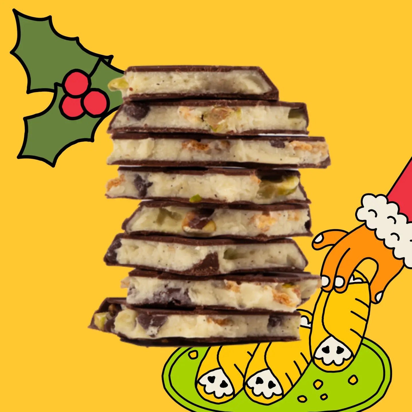 Dark chocolate with a white chocolate meltaway center, dotted with mini chocolate chips, crispy cannoli pieces, and a sprinkle of pistachios. All the flavor of the Italian bakery classic, with a little more sparkle and a lot more chocolate. (2.5oz)