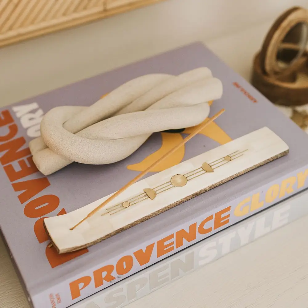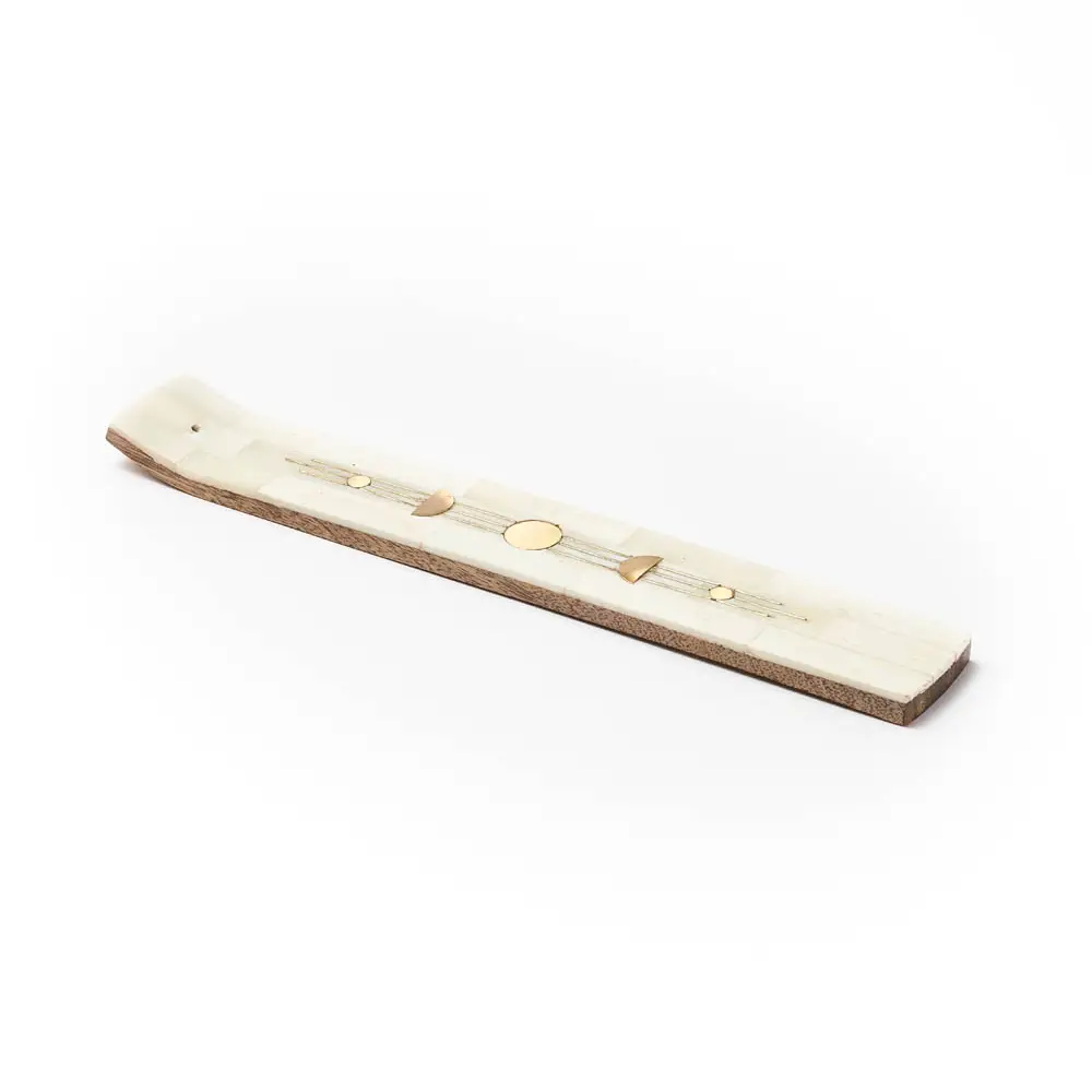 The art of traditional Indian wood craft requires mastery, passed on through generations, to create intricately hand carved treasures from solid blocks of mango wood. Master artisans intricately hand carve bone elements to span the base of the incense holder. Brass elements are expertly handcrafted and inlaid in this intricate lunar moon phase design for a refined, eye-catching result. This incense holder features a small hole at the raised end where an incense stick can be inserted. Dimensions: 10" L x 1.75" W