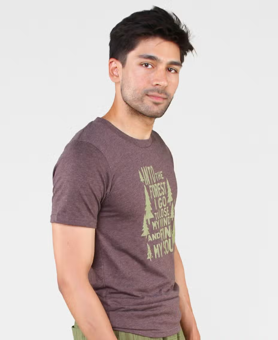 Lose your mind and find your soul in this eco-friendly, forest-friendly t-shirt. With a vintage-inspired pine tree design and treehugger-inspired text, this tee promotes a love of the earth, regardless of where you are. Made in the USA. 50% organic cotton, 50% recycled plastic (from recycled beverage bottles).