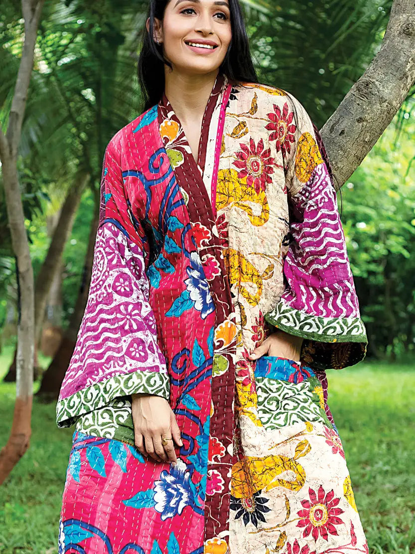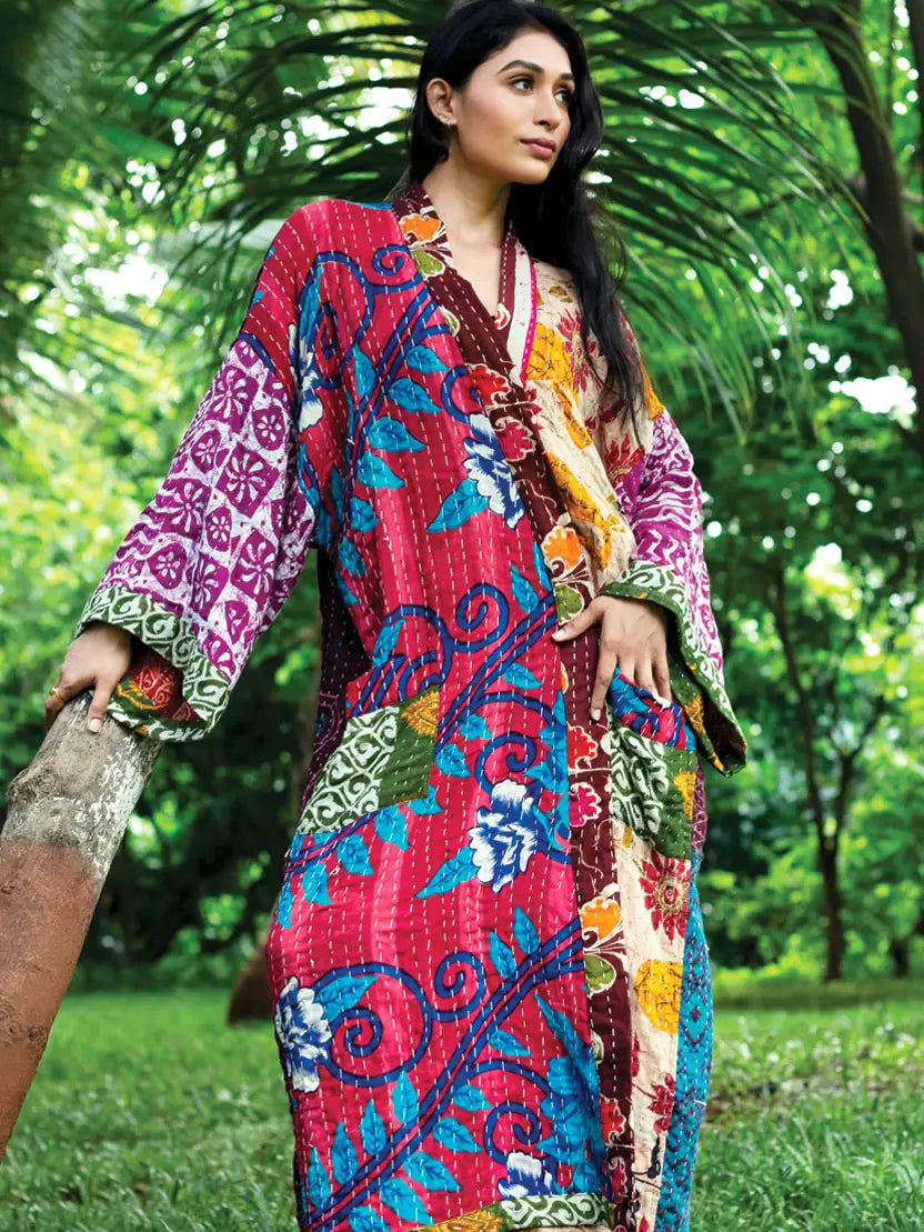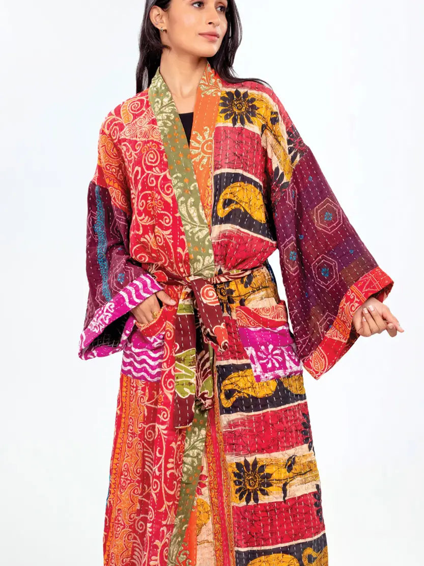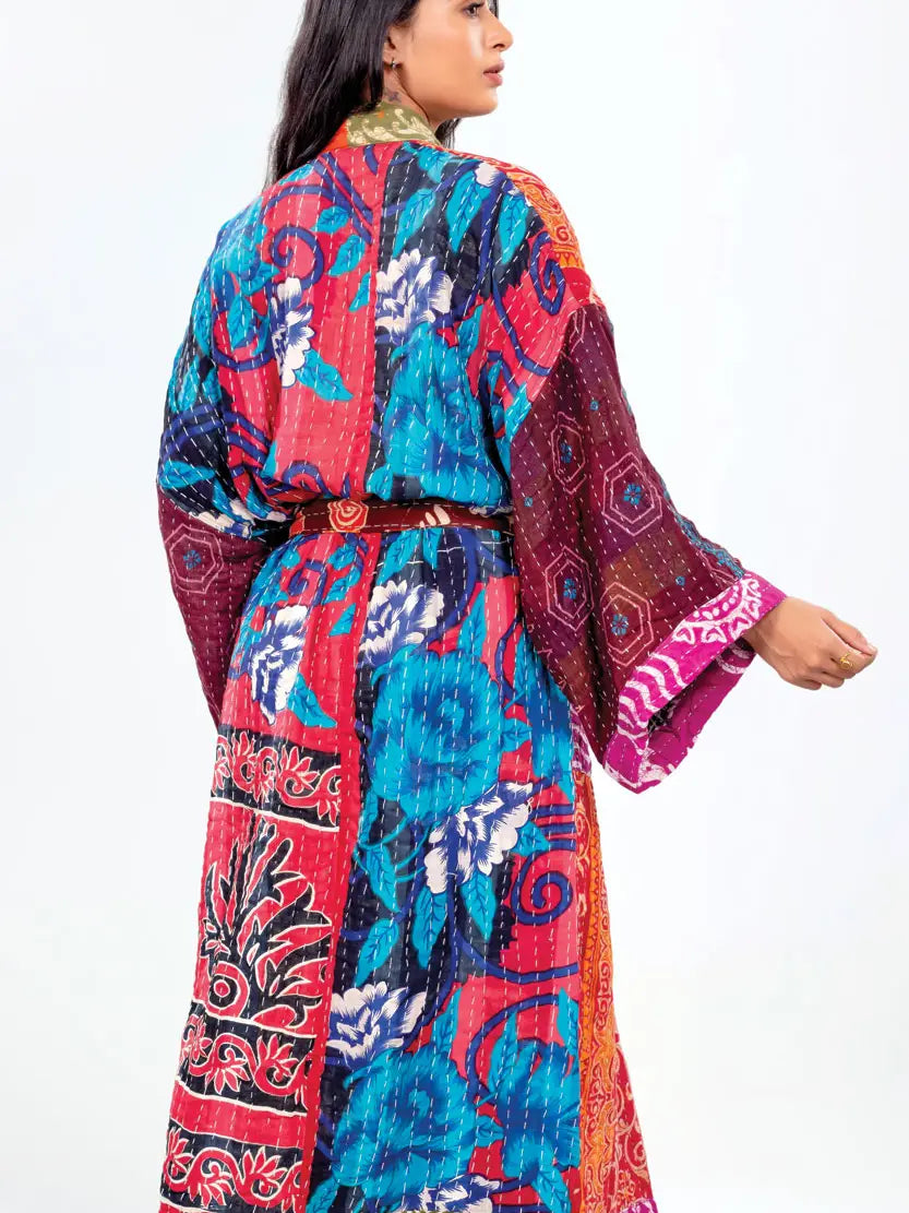 Our stunning Kantha Kimono Robe is handmade by women artisans in India using 100% cotton up-cycled saris. Each piece is uniquely beautiful and is made from saris that are intricately stitched together using the traditional “kantha” embroidery technique. Designed in a contemporary, elegant cut with different sari prints quilted together, these fair trade robes are truly a wearable work of art. Features pockets and a belt tie at the waist. One size fits most, comes in assorted prints and colors.