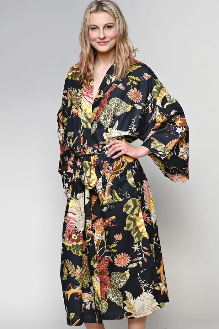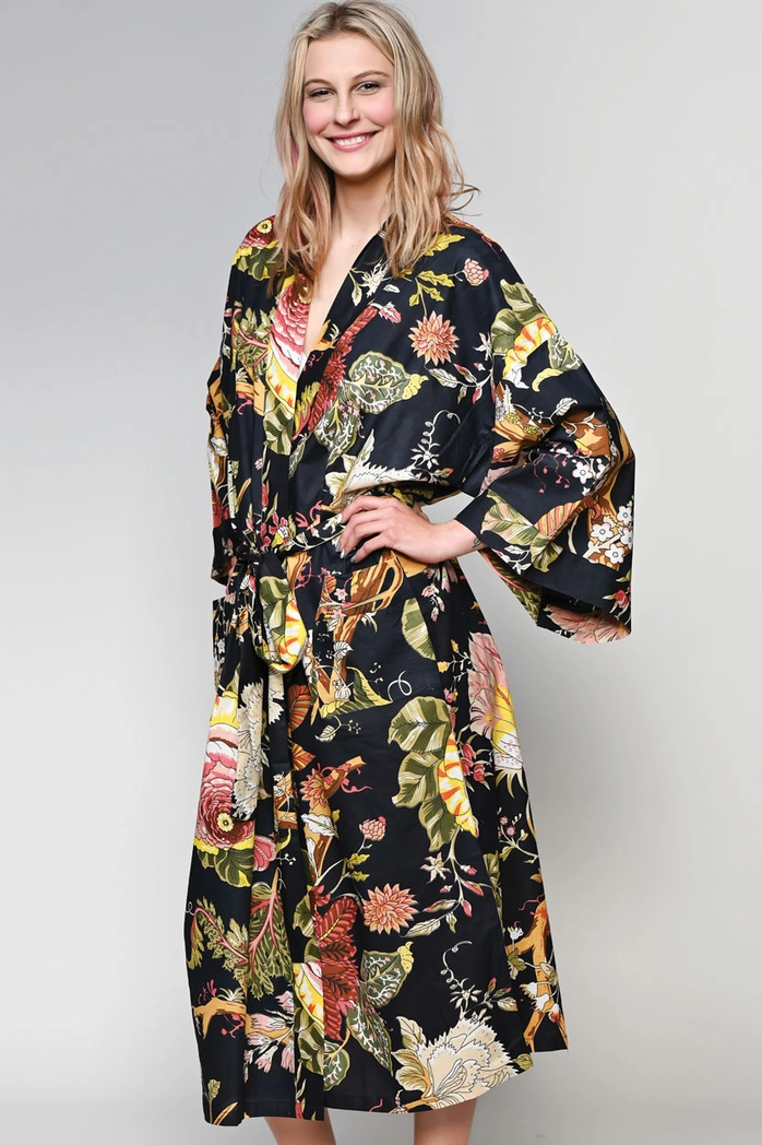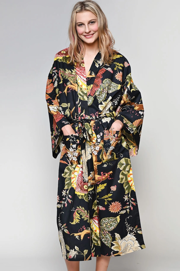 Our luxurious Kimono Robes showcase vibrant artistic prints on 100% soft cotton. Artisans in Rajasthan, India print the fabric for our fair trade robes using eco-friendly dyes. These beautiful cotton robes feature large pockets and are machine washable. One size fits most, 52" length.