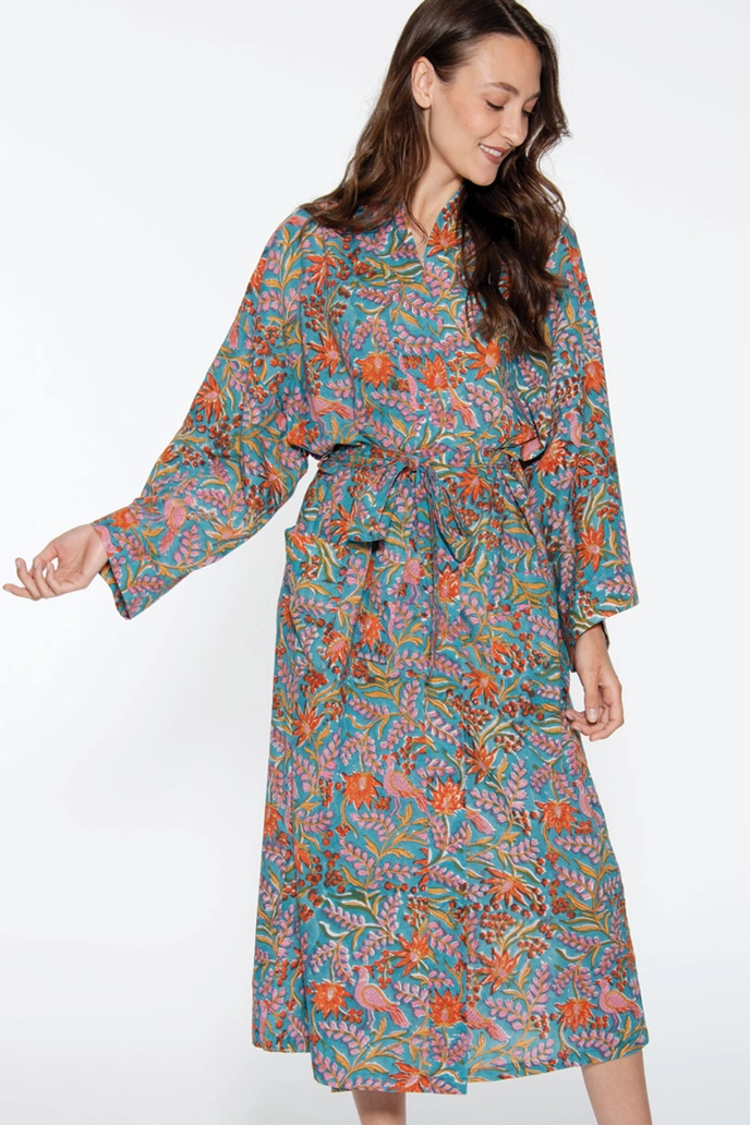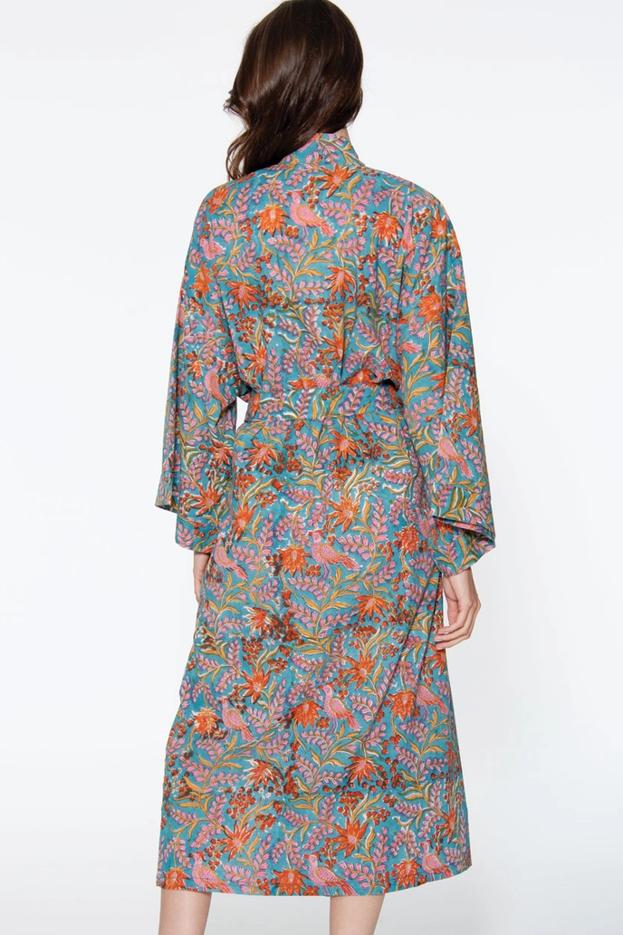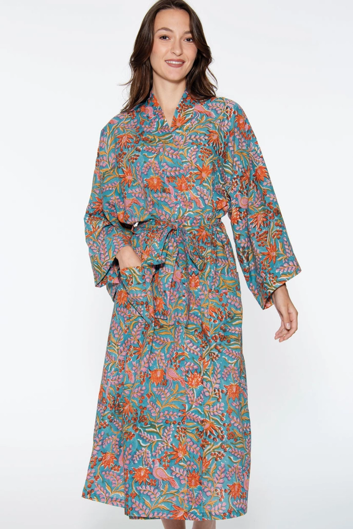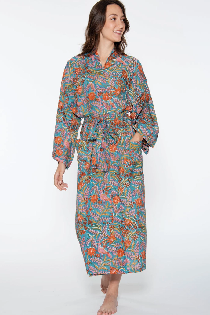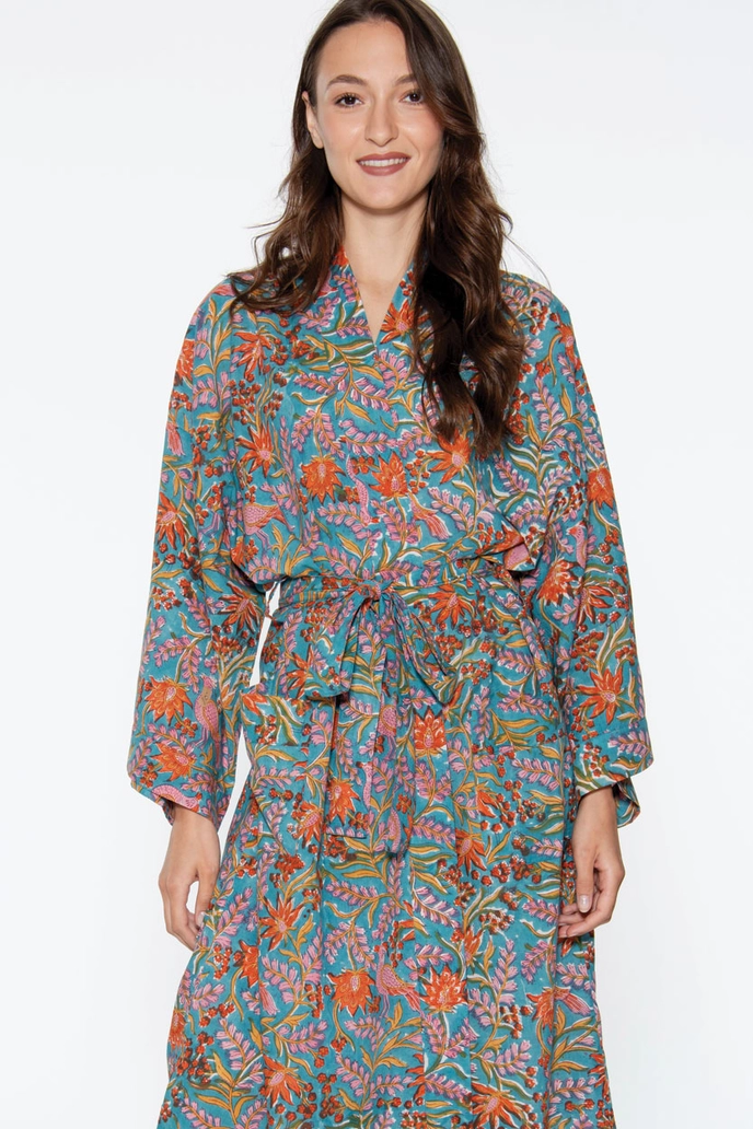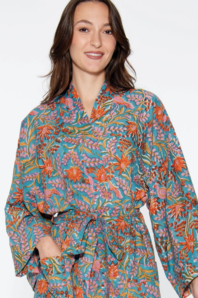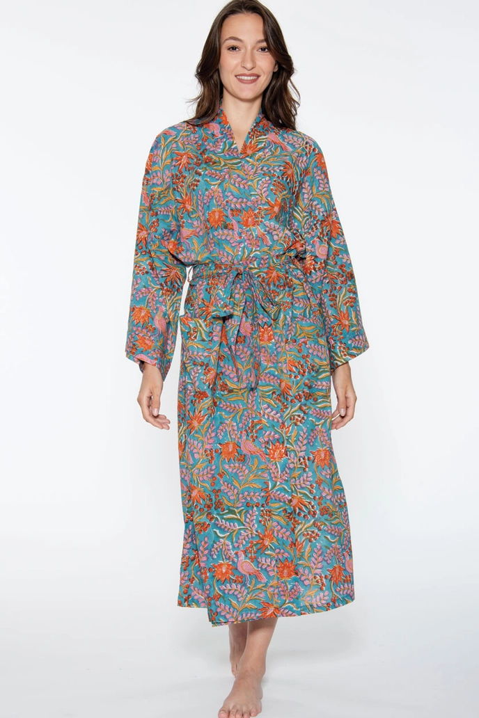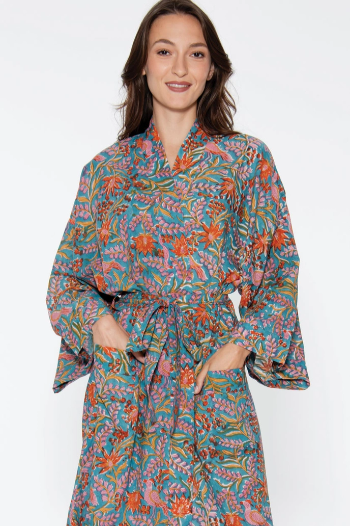 Our Reva Kimono Robes are hand block-printed on soft 100% cotton material by artisans in Rajasthan, India. The wooden blocks are first hand-carved and the design is then hand-stamped using a different block for each color in the pattern. The seamless printing shows the fine skill of the block-printers, and it is a craft that has been passed down from generation to generation. Each region of India has a different style of block-printing, and each family has their own collection of wooden blocks. These beautiful fair trade robes feature large pockets and a belt, and are machine washable. One size fits most, 52" length.