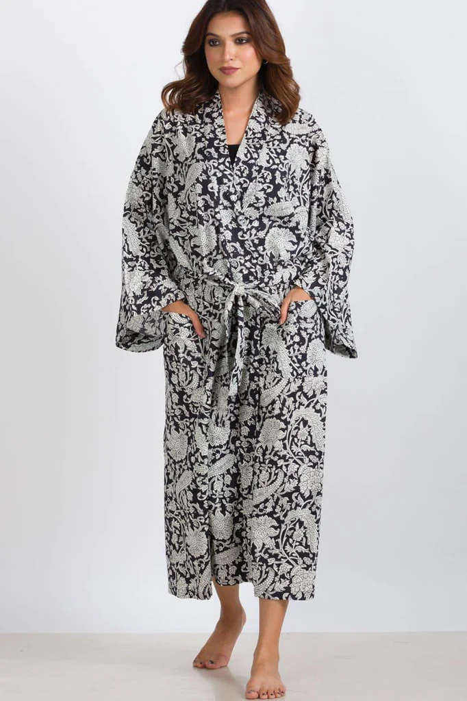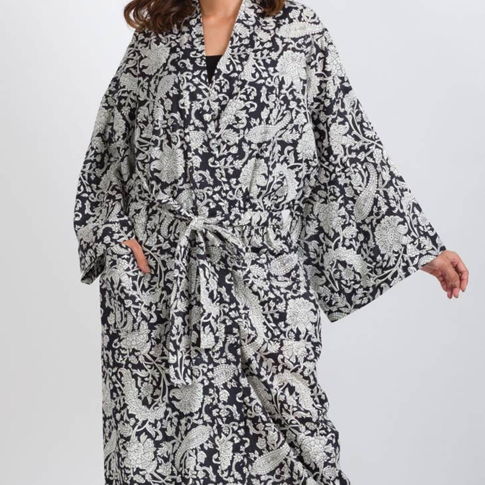 Our luxurious Kimono Robes showcase vibrant artistic prints on 100% soft cotton. Artisans in Rajasthan, India print the fabric for our fair trade robes using eco-friendly dyes. These beautiful cotton robes feature large pockets and are machine washable. One size fits most, 52" length.