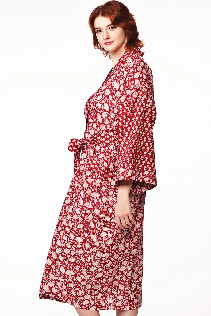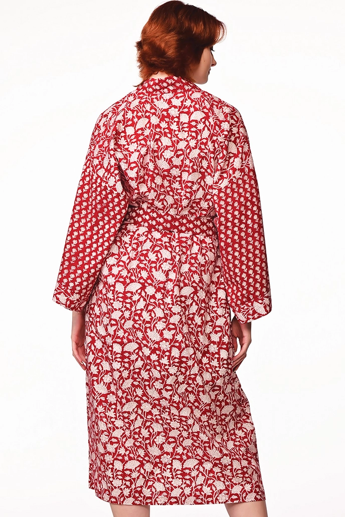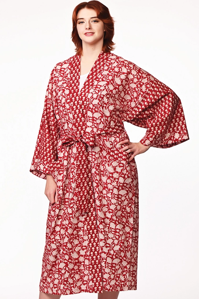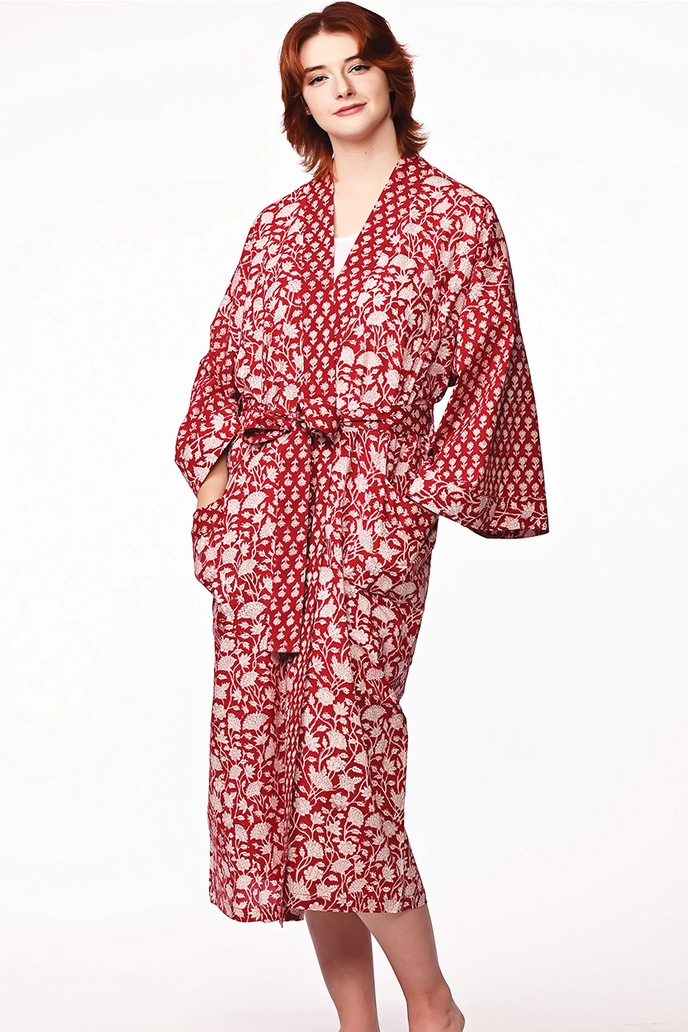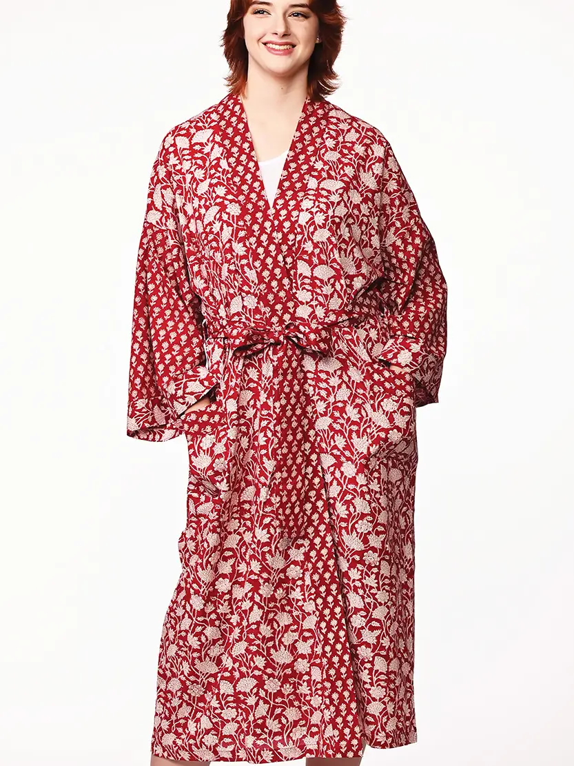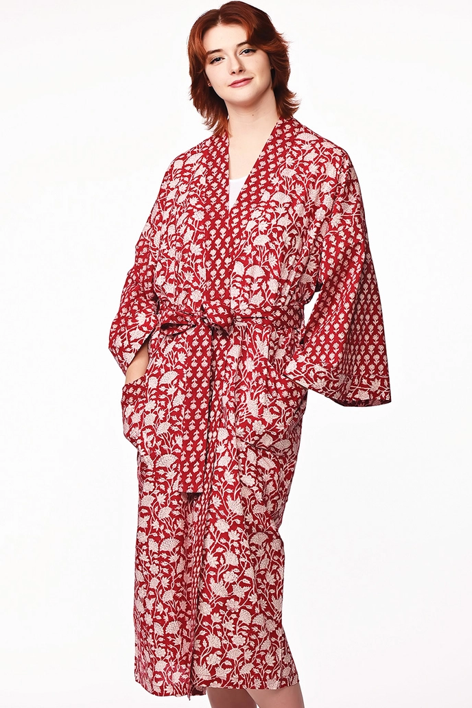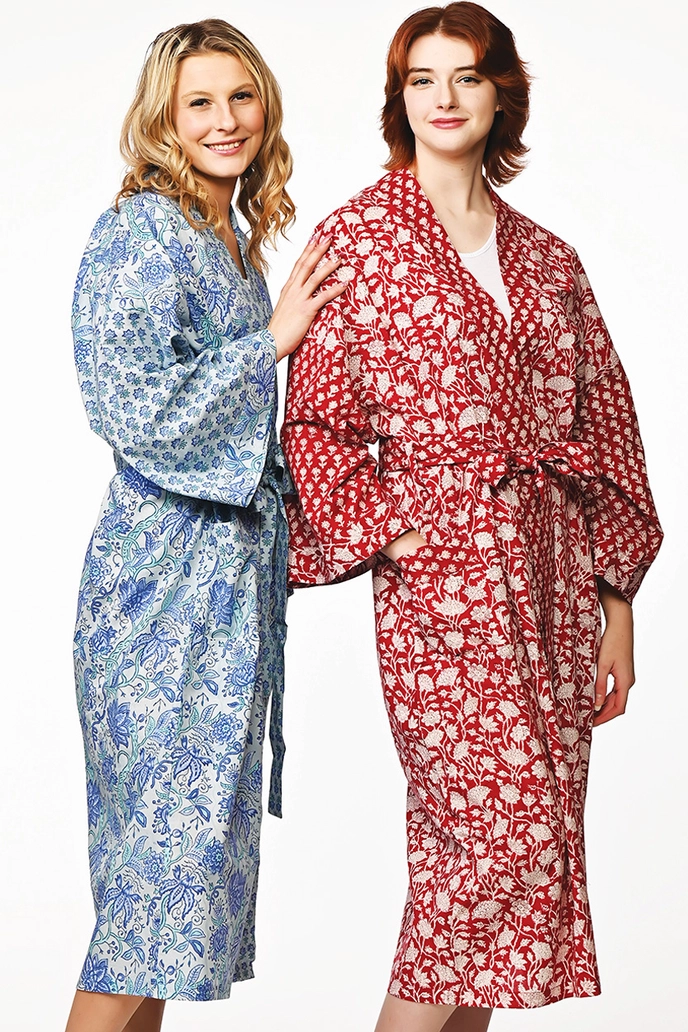 Our Sangita Kimono Robes are hand block-printed on soft 100% cotton material by artisans in Rajasthan, India. The wooden blocks are first hand-carved and the design is then hand-stamped using a different block for each color in the pattern. The seamless printing shows the fine skill of the block-printers, and it is a craft that has been passed down from generation to generation. Each region of India has a different style of block-printing, and each family has their own collection of wooden blocks. These beautiful fair trade robes feature large pockets and contrast prints on the sleeves and placket, and are machine washable. One size fits most, 52" length.
