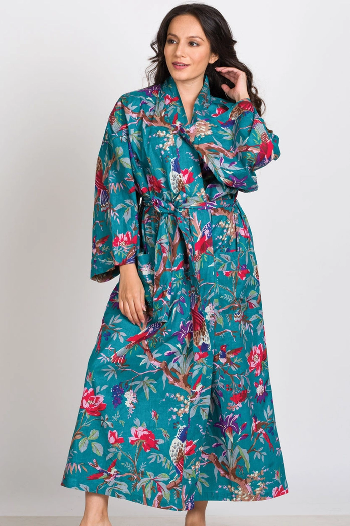 Our luxurious Kimono Robes showcase vibrant artistic prints on 100% soft cotton. Artisans in Rajasthan, India print the fabric for our fair trade robes using eco-friendly dyes. These beautiful cotton robes feature large pockets and are machine washable. One size fits most, 52" length.