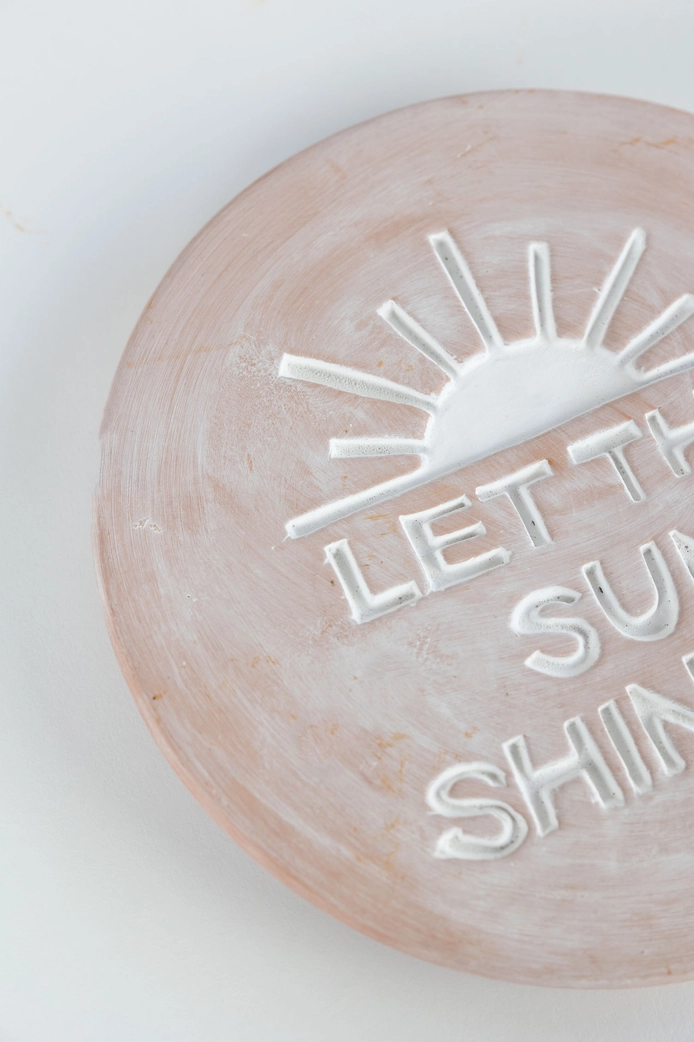 Bring a touch of sunshine into your home with this beautifully handcrafted garden plaque. The whitewashed terracotta is a perfect backdrop for the cheerful words "Let the Sun Shine In," reminding you to find joy and peace in life's everyday moments. Hang indoors or out to bring a little sunshine to any space. Ethically handcrafted in small batches by artisans with Corr‒The Jute Works, a women's nonprofit with 4,000 rural artisans across 154 workshops. One of the country's largest exporters of handicrafts, it is member‒owned and operated. By purchasing this piece, you become part of the story, helping break the generational poverty cycle.
