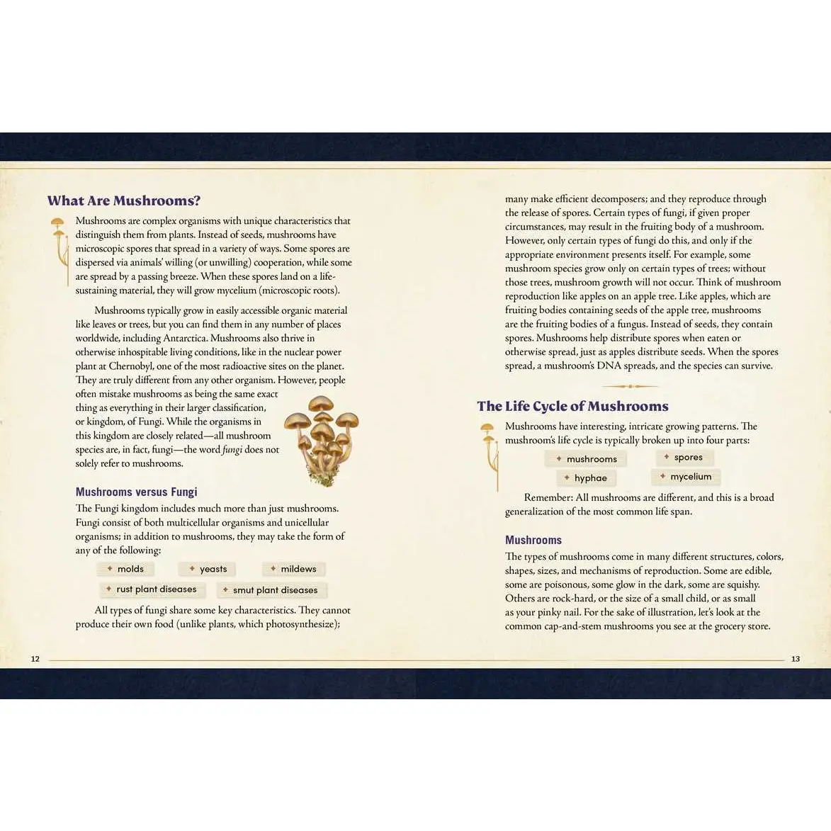 This book is a collection of everything you need to know about 75 of the world's most unique mushrooms. With information on their etymology, geographic location, characteristics, and culinary or healing powers, this book is the perfect companion for amateur mushroom hunters, cottage-core fans, or anyone just looking for a beautifully illustrated book on some of the most incredible fungi around the world.