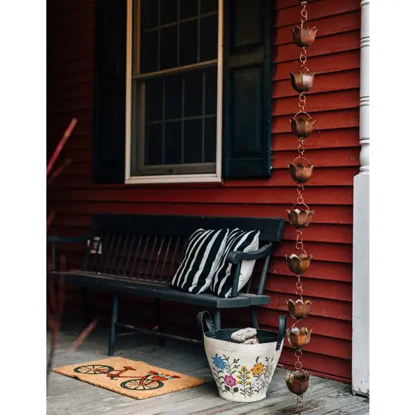 A gorgeous addition to any patio, the Lotus Rain Chain is handcrafted by artisans working with our fair trade partner Noah's Ark. Iron - Cups: 5W x 3.5D x 5H (including handle) inches, Hole in the bottom of each cup: 1D inches, Rain chain (including hanger): approximately 7.5 feet long - Includes 11 lotus flower shaped cups and a V‒shaped hanger for attaching to a rain spout - Handcrafted in India