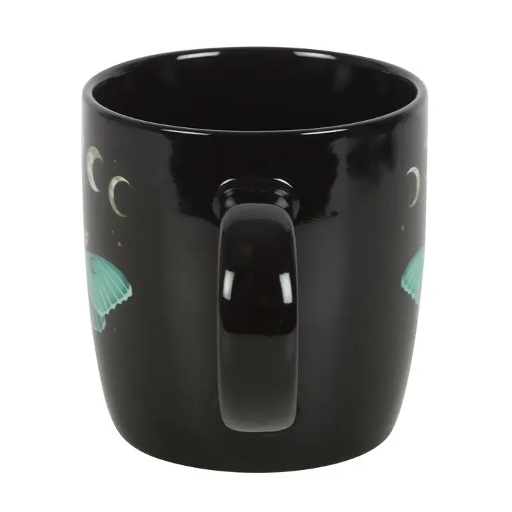 Add a touch of enchantment to your morning cuppa with this dark forest luna moth ceramic mug. This black ceramic mug features a captivating and intricate luna moth design, including moon phases, stars and flowers. 340ml capacity, dishwasher and microwave safe.