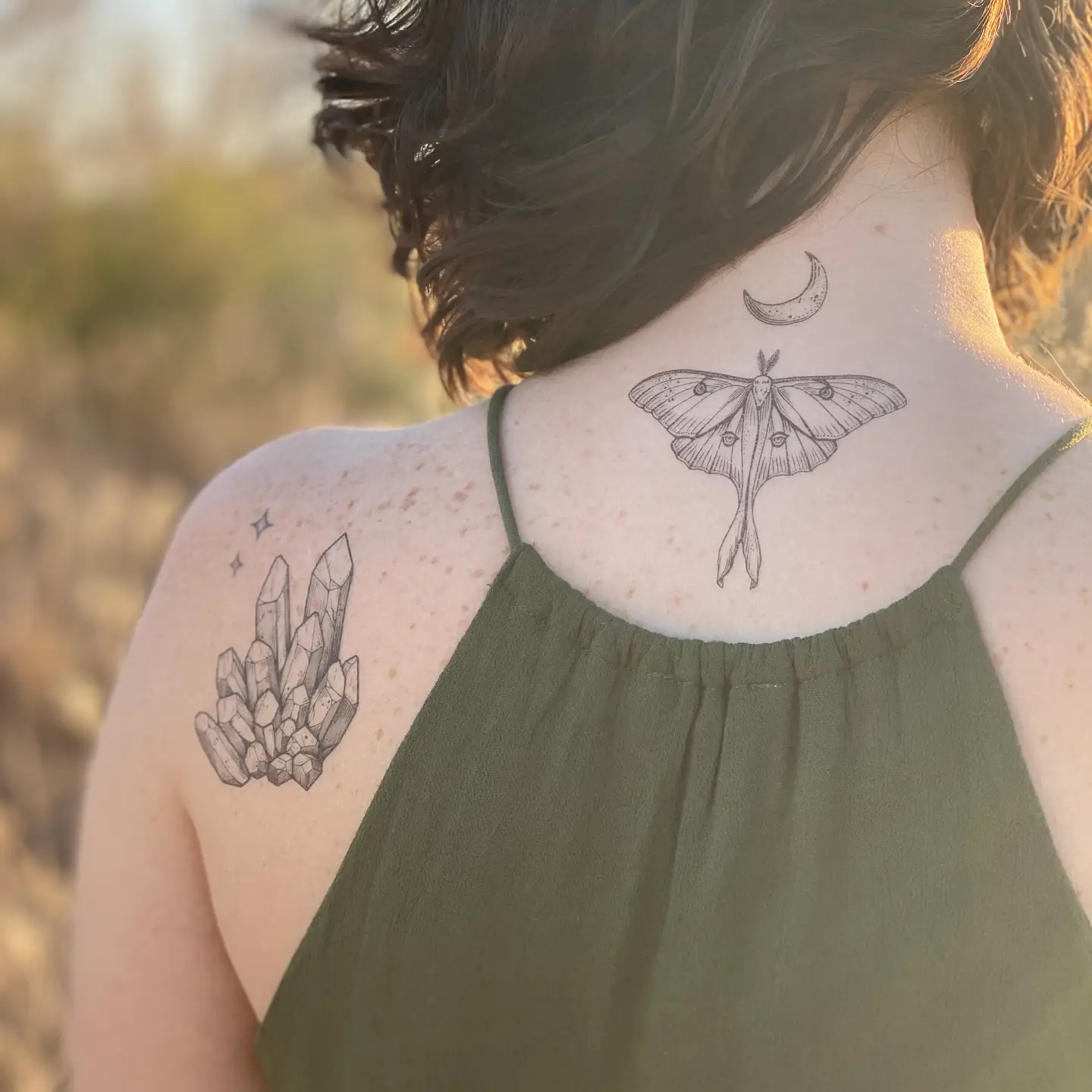 Luna Moth temporary tattoo. Luna moths are a pale green moth, with small eye-shaped patterns on each wing. Their wings each have an elongated double ribbon-like tail, which is one of their most recognizable features. This original hand-drawn design has a furry little body, a wide wingspan, and a crescent moon above.