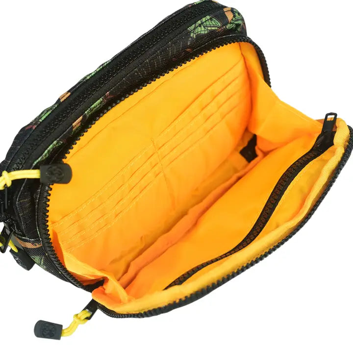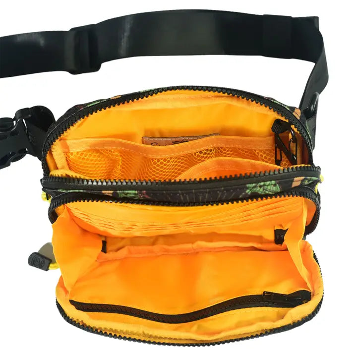 Graceful Luna moths rise and descend amongst crescent moons & stars. Our new Wally Pack is wallet meets fanny pack! This card slot fanny pack is the answer to the requests we have been hearing for almost 5 years! It is the perfect combination of a fanny pack, chest bag and wallet all in one! -Bag Measures 8.25" wide x “5.75" tall x 2" deep -Fits hip/waist size 14”-51” * a 12 inch extender is available also! -The front zippered compartment contains 8 card slots and an zippered compartment for cash and coins. -The largest zippered compartment contains a mesh open pocket and a second open pocket plus a key clip. -The back has an open pocket for quick access to your phone. -The adjustable strap is custom woven jacquard that reads "Live Your One Wild Life." -Made with 100% recycled water-resistant polyester 💧♻️ -YKK zippers (the most trusted brand in zippers) -Built for doin' stuff