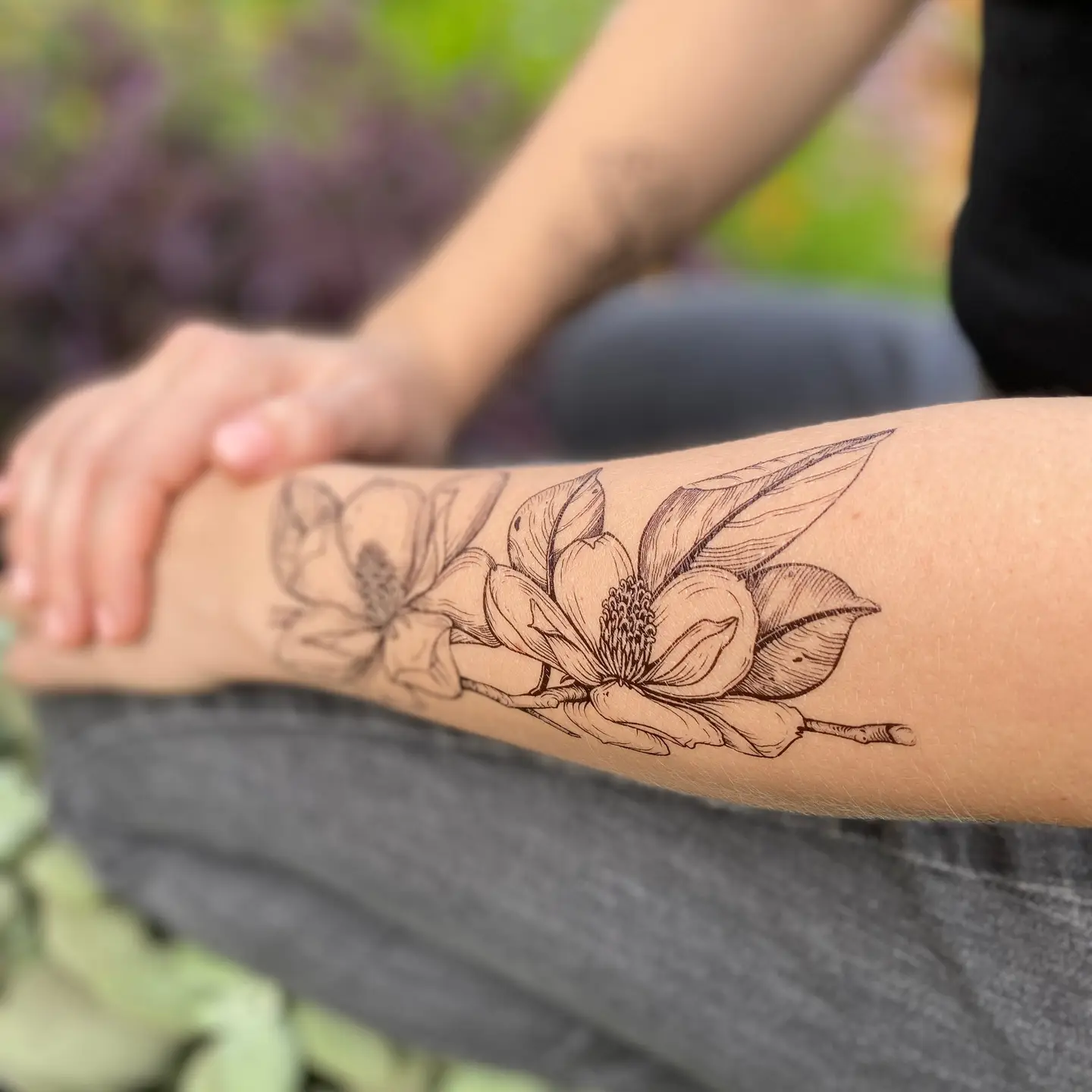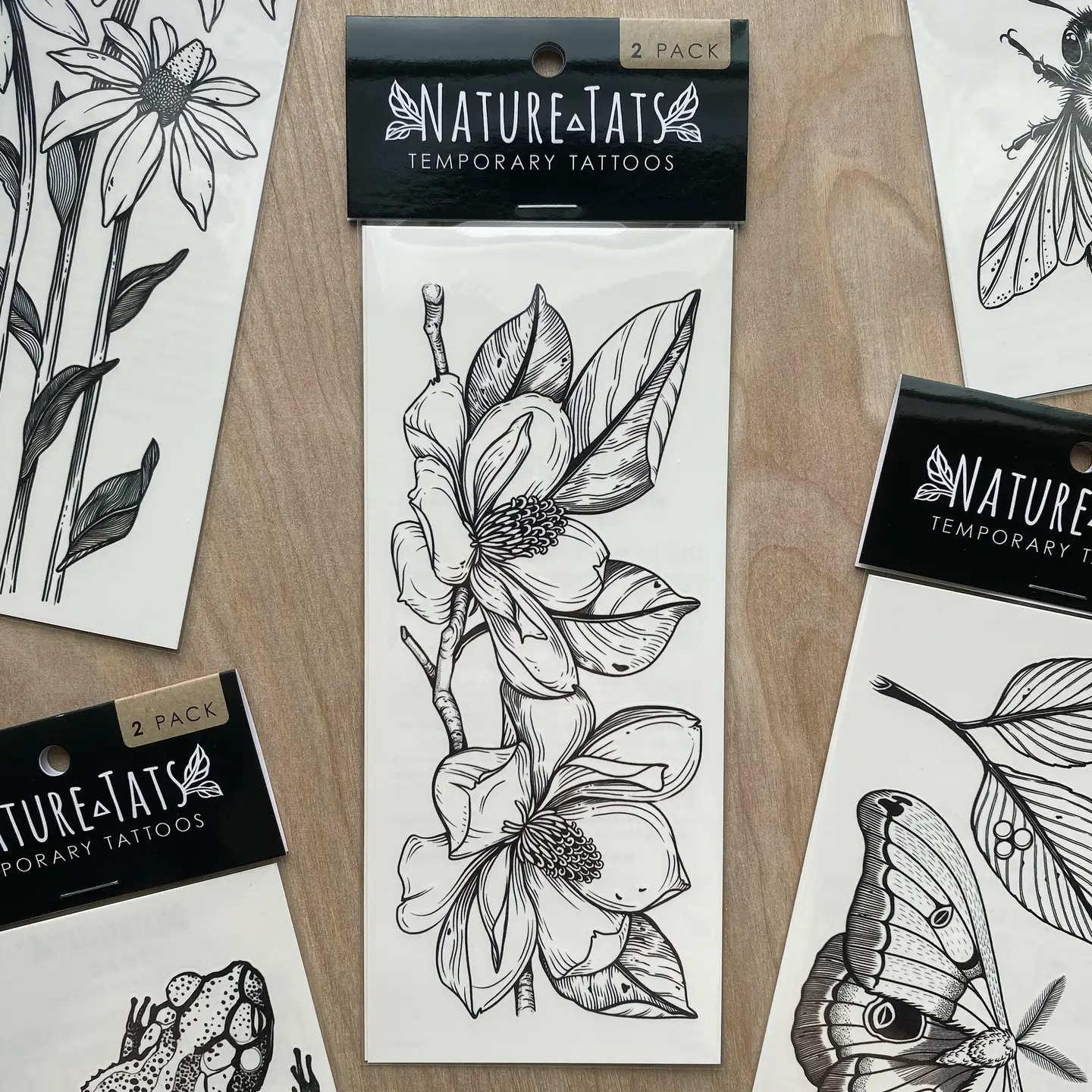Magnolia Flowers temporary tattoo! This hand-drawn floral design measures 6.25 by 2.5 inches with black lines and stippling. This pair of southern magnolia flowers are attached to a thin branch with four fresh leaves surrounding the petals.