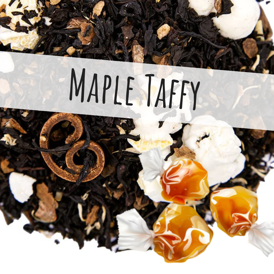 The traditional way of making Canadian maple taffy is to take heated maple syrup and pour it on a layer of snow which rapidly cools the syrup and thickens it. We blend black tea with real dehydrated maple syrup, cinnamon, and popcorn to make Maple Taffy tea a real treat.