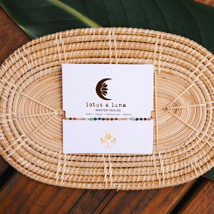 Shimmering metal accents combined with natural healing stones. Offered with gold beads and chain clasp, pair with the matching Master Healer Necklace for an elegant set that you'll never want to take off.
