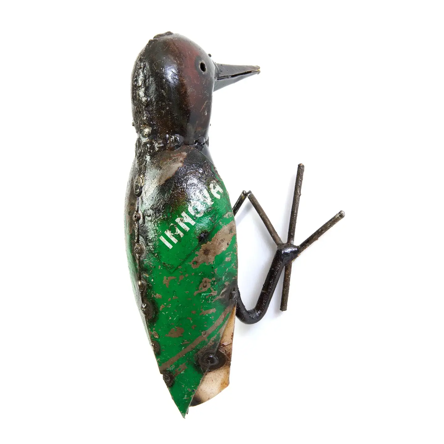 Zimbabwean sculptor Adam Mvumbu transforms colorful oil drums into a whimsical woodpecker sculpture, complete with a tab for affixing to the wall or a fence. Each sculpture is assorted in color and is finished with varnish to protect against the elements.