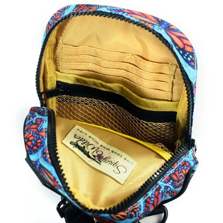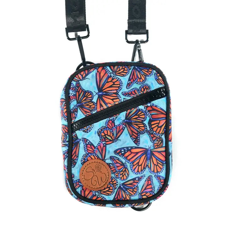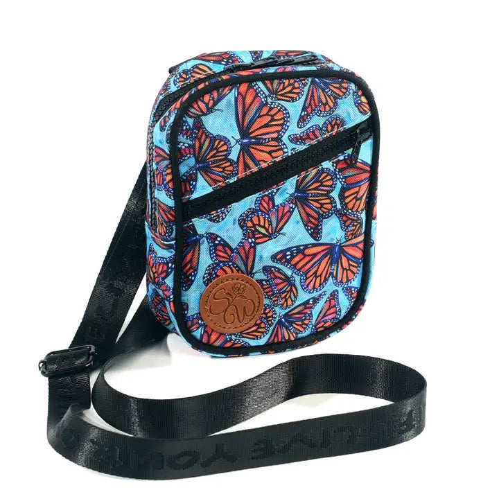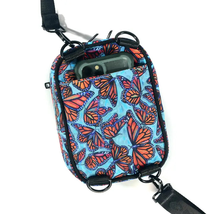 Majestic Monarchs flutter and float in this striking collaboration with Florida artist Samm Wehman! Our newly re-designed Snapshot Bag is the perfect little crossbody! You can also attach one end of your strap to the alternate d-ring on the bottom to convert to a chest bag.