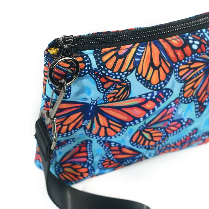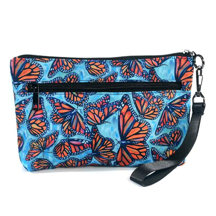 Majestic Monarchs flutter and float in this striking collaboration with Florida artist Samm Wehman! Toss this organizer pouch in a larger bag to help you sort your stuff or use as a wristlet pouch. This organizer pouch perfectly matches our large venture totes. -Measures 6.5 x 10 inches -Includes 6" wristlet strap -Premium water resistant polyester made from recycled plastic, easy clean nylon liner. Metal Hardware.